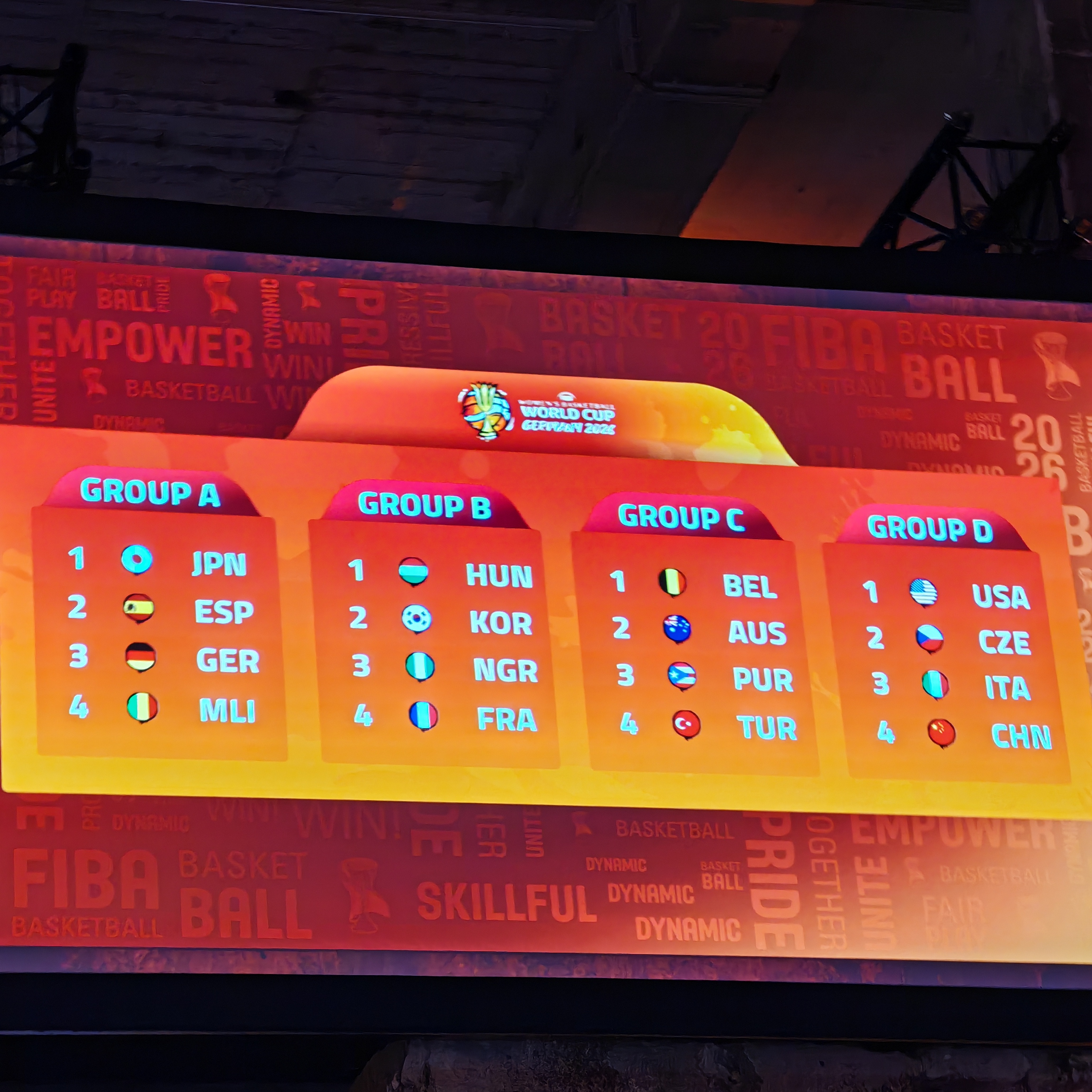 根据规则,本届赛事的16支球队被分为4个小组,每组4队。日本、西班牙、德国、马里队同在A组;匈牙利、韩国、尼日利亚和法国队同在B组;比利时、澳大利亚、波多黎各和土耳其队在C组相遇;D组球队分别为美国、捷克、意大利和中国队。
