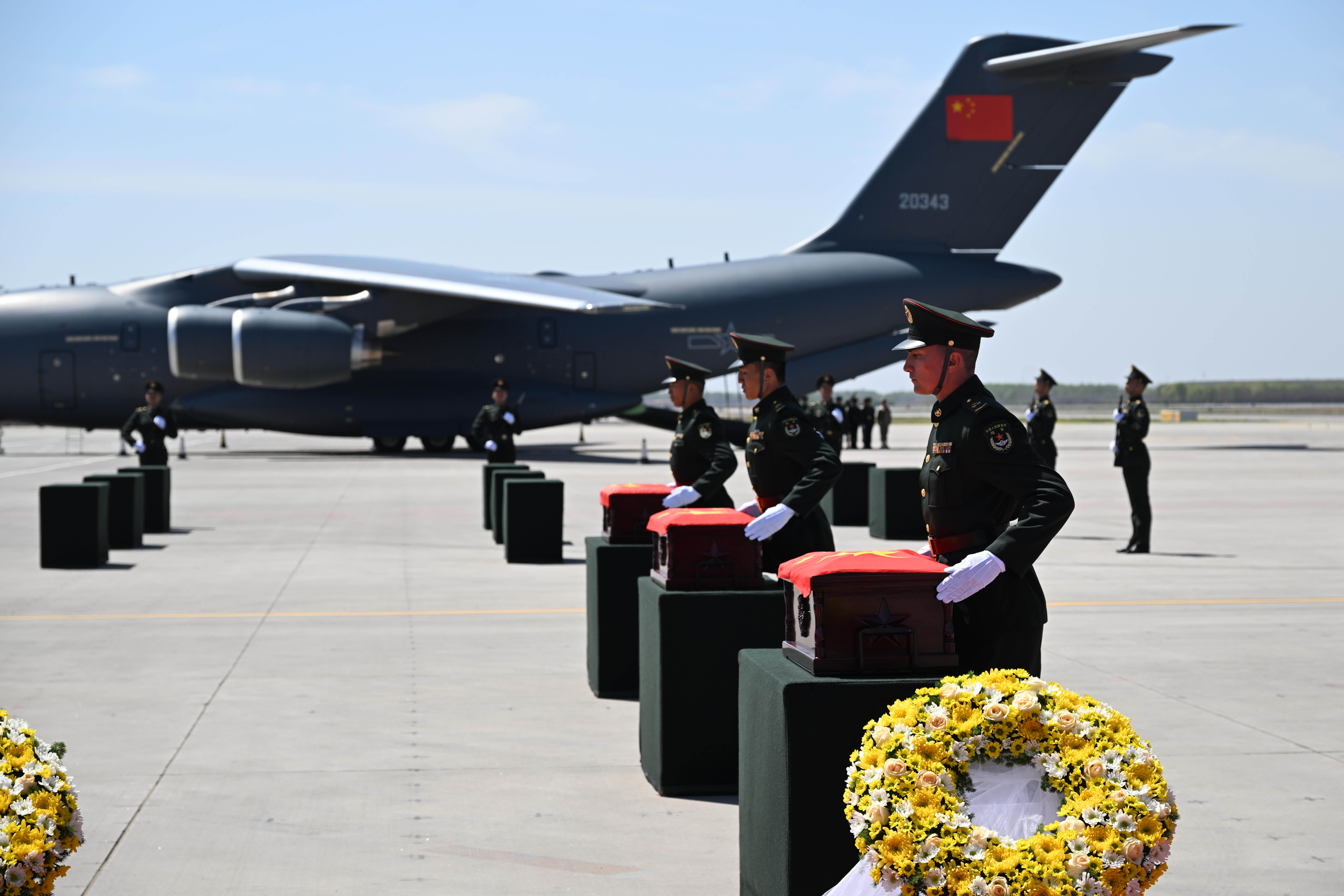 A+ A. A-4月22日,第十三批在韩中国人民志愿军烈士遗骸由中国空军运-20B从韩国接回辽宁沈阳。这是迎回仪式上,礼兵将覆盖着五星红旗的志愿军烈士遗骸棺椁整齐安放。新华社发(余红春 摄)