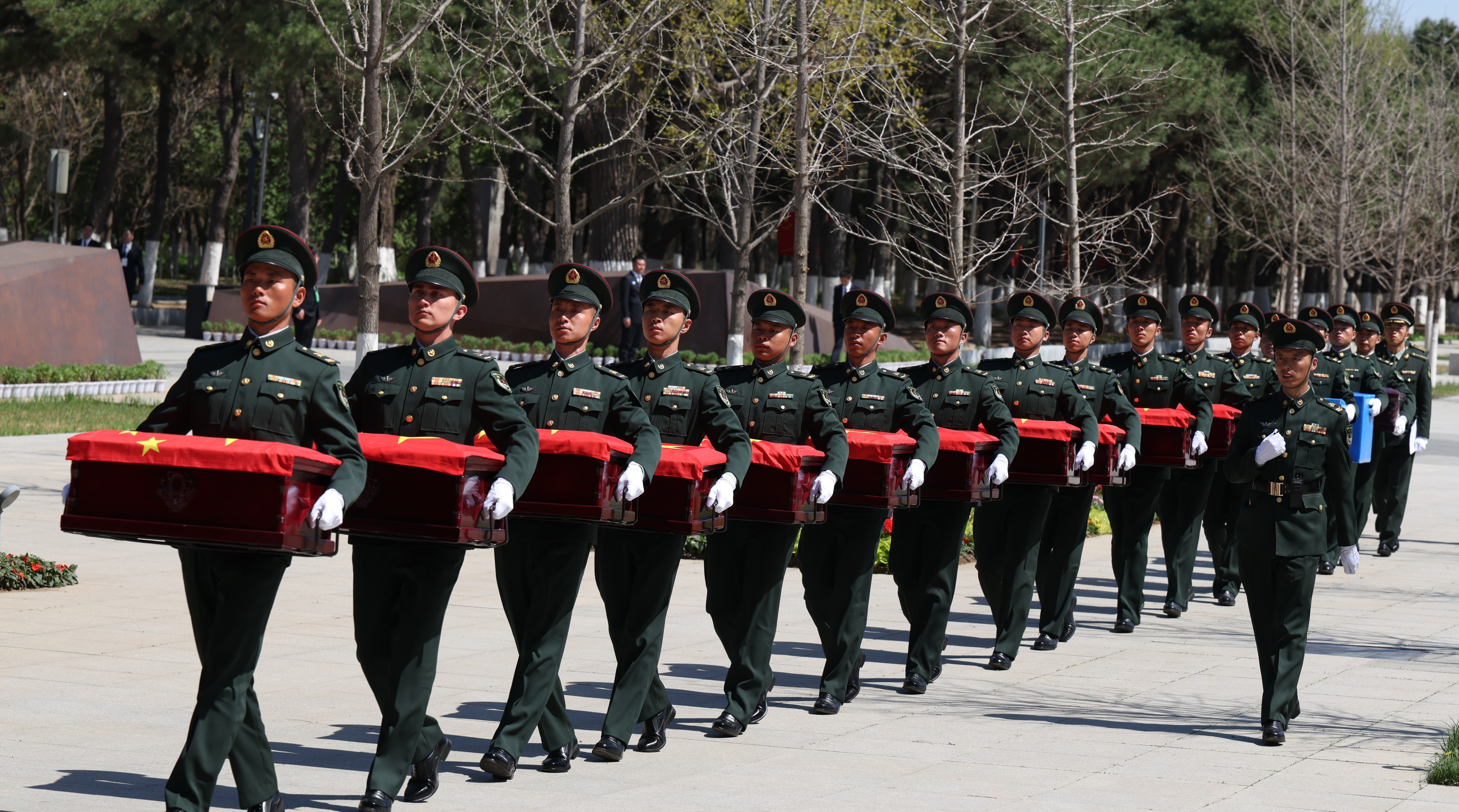 4月22日,礼兵护送志愿军烈士遗骸棺椁抵达沈阳抗美援朝烈士陵园。新华社记者 杨青 摄