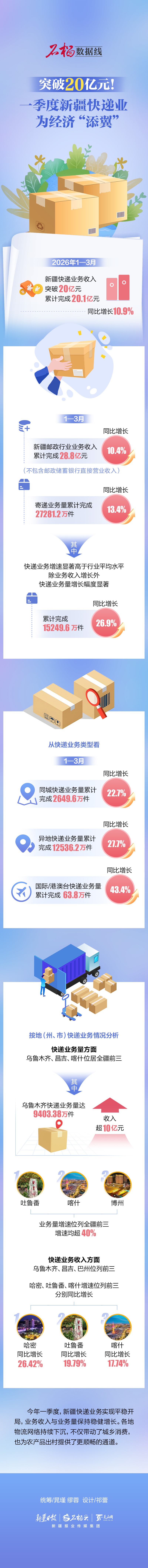 2026年1—3月新疆邮政行业运行情况公布,新疆快递业务收入突破20亿元,累计完成20.1亿元,同比增长10.9%。