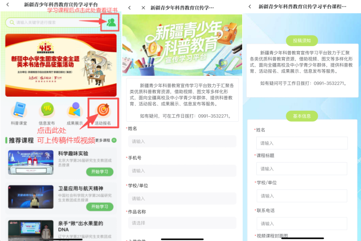 欢迎科普机构、学校、团委或者其他相关组织加入这场“科学派对”,无论是科普讲座、研学实践、科技比赛,还是特色课程、主题活动……只要你有好点子、好活动,都可以在平台上发布,让全疆的小伙伴一起参与!咨询电话:0991-3532271。