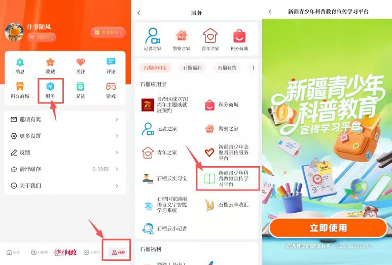 打开石榴云客户端,点击底部导航栏的“我的”,进入“服务专区”,找到“新疆青少年科普教育宣传学习平台”入口。