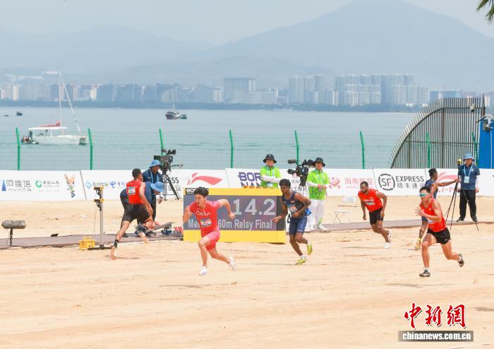 4月26日,在海南三亚举行的第六届亚洲沙滩运动会沙滩田径男子4x60米接力决赛中,中国队获得冠军。 中新社记者 贾天勇 摄