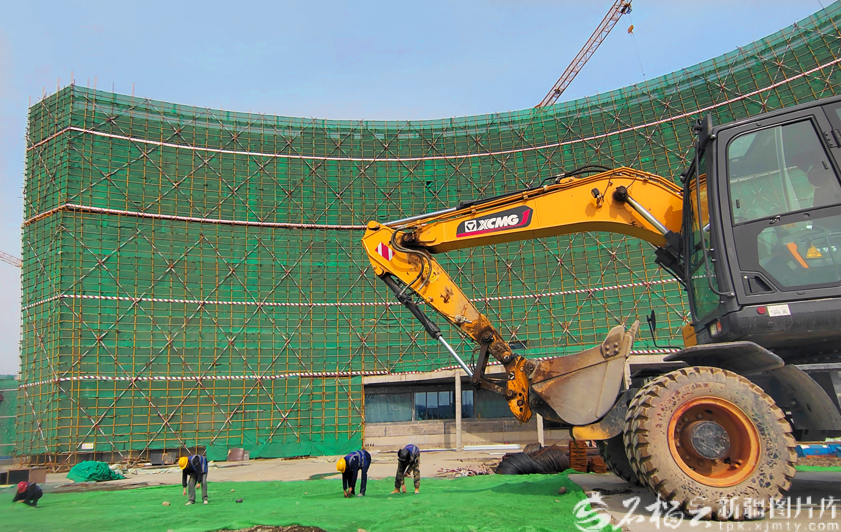 新疆华世丹药业国际产业园内,工作人员在施工现场铺设防尘网。(资料图)
