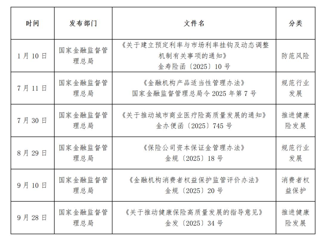 2025年三季度,金监局等政府部门重点围绕防范风险、促进发展、规范经营、加强消费者权益保护等方面出台多项政策,引导人身险行业长期可持续发展。
