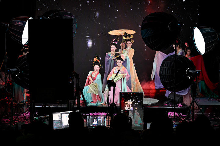 陕西省歌舞剧院的舞蹈演员在直播间进行“团播”表演(2025年12月25日摄)。“团播”这一多人演艺直播新形式,正成为专业文艺院团开辟线上“第二舞台”、推动传统文化创新表达的新尝试。“竖屏化”“快节奏”的改编,让传统剧目受到越来越多年轻人喜爱。数据显示,陕西省歌舞剧院“团播”单场最高曝光量超500万,带动线下票房增长约10%。