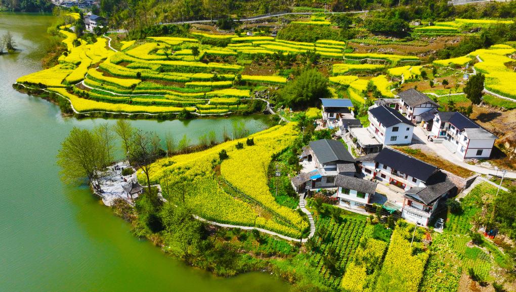 重庆市黔江区阿蓬江镇大坪村油菜花开放(2026年3月4日摄,无人机照片)。新华社发(杨敏 摄)