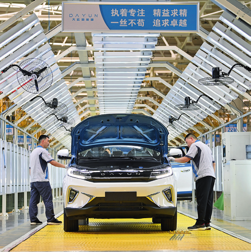在位于山西省运城市经济技术开发区的大运新能源汽车生产基地,新能源汽车准备下线 (2024年6月13日摄) 杨晨光摄 / 本刊