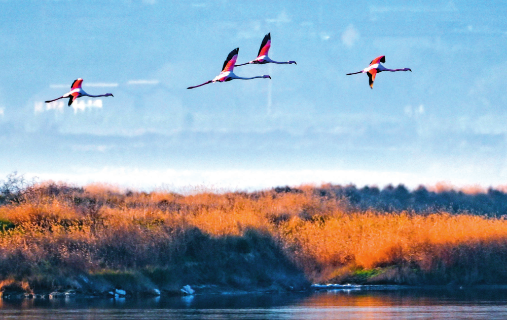 火烈鸟在山西省运城盐湖湿地飞翔(2025年11月19日摄) 新华社发(薛俊摄)