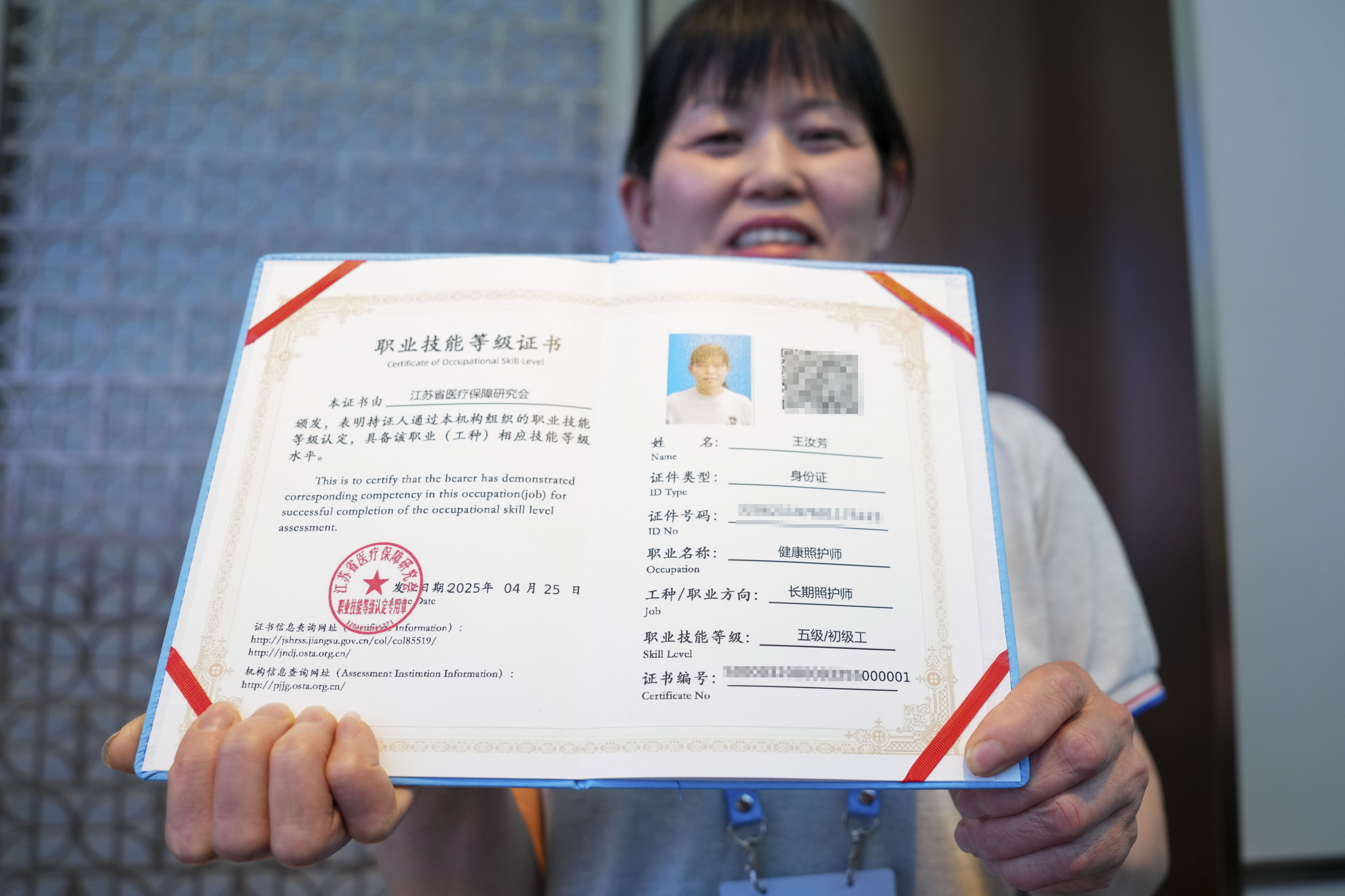 2025年4月28日,首批长期照护师职业技能等级证书颁发。新华社记者 李博 摄