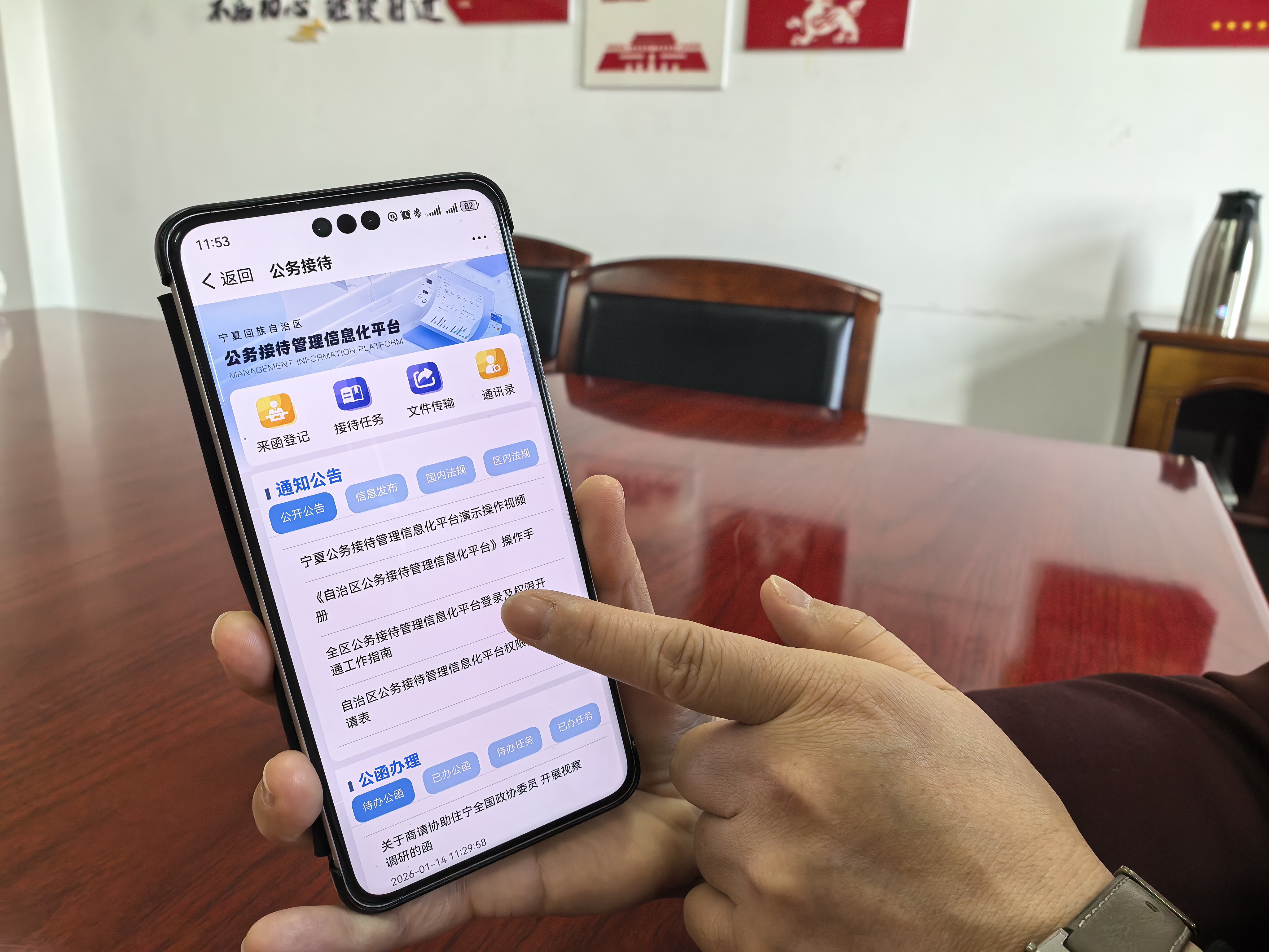2026年1月21日,宁夏回族自治区石嘴山市机关事务服务中心工作人员通过手机应用程序操作全区公务接待管理信息化平台。新华社记者 邹欣媛 摄