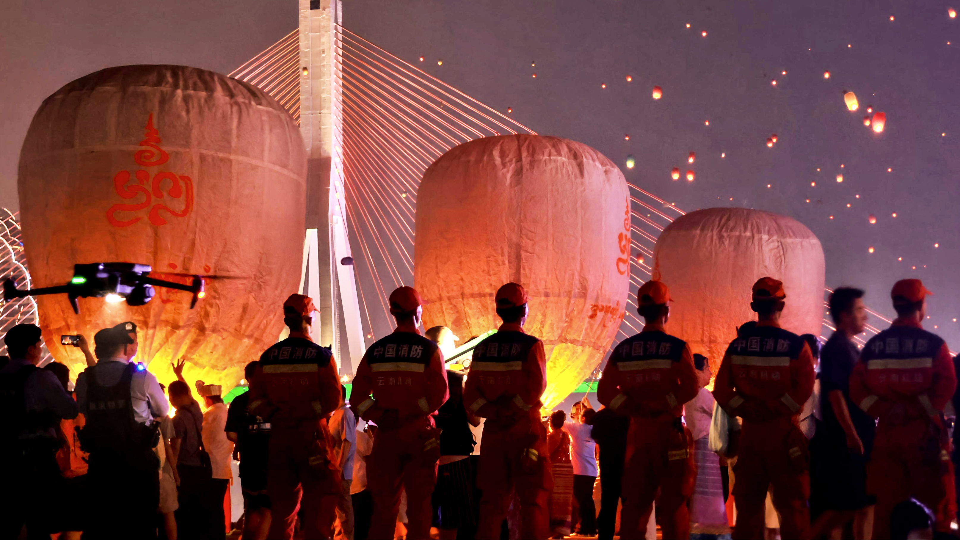 2026年4月13日,在云南省西双版纳傣族自治州景洪市澜沧江畔,消防员在“万人齐放孔明灯”活动现场维护秩序。新华社发(陈云龙 摄)