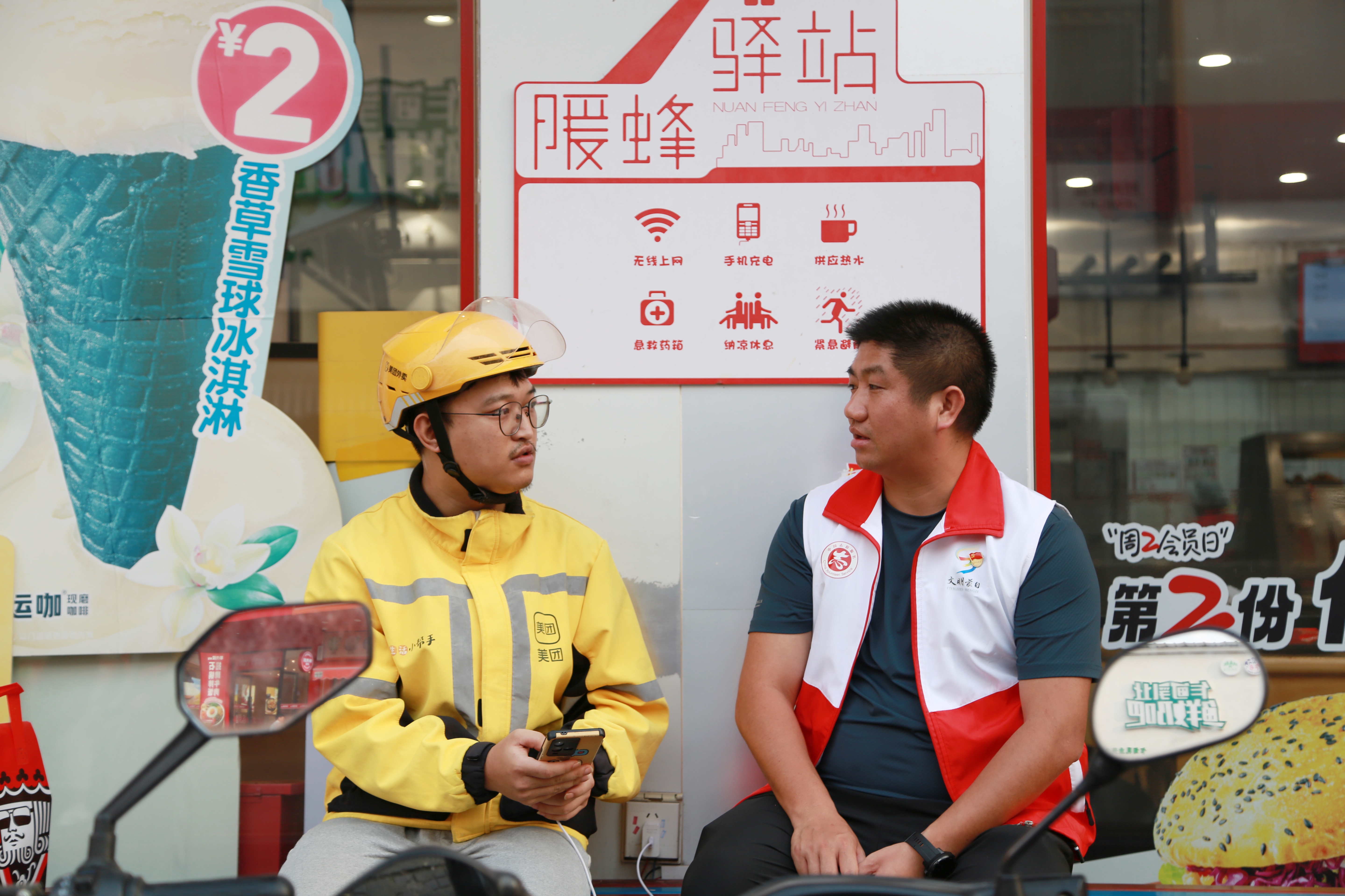 2026年4月15日,云南省红河州蒙自市一名干部在“暖蜂驿站”与骑手交流。新华社发(薛莹莹 摄)