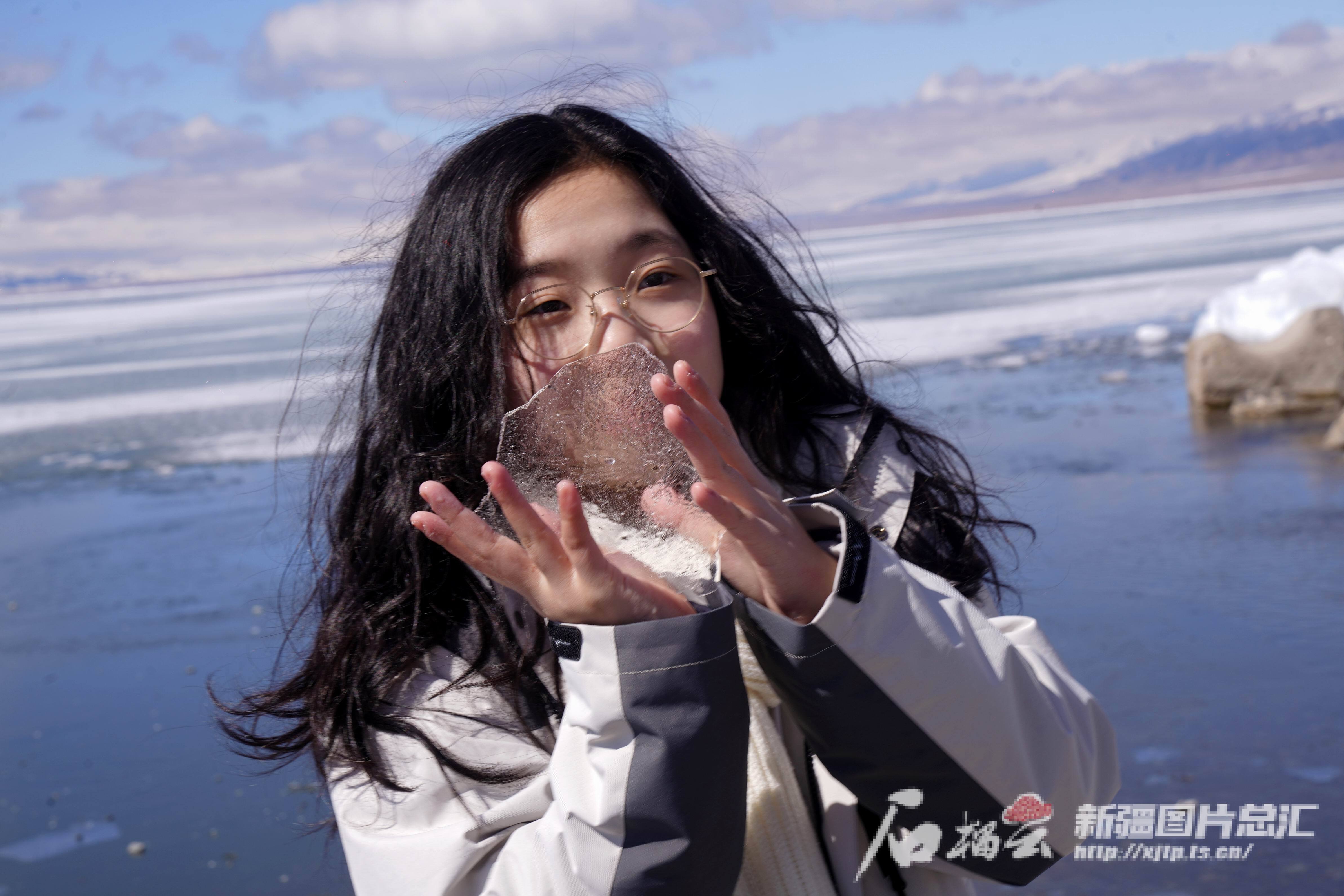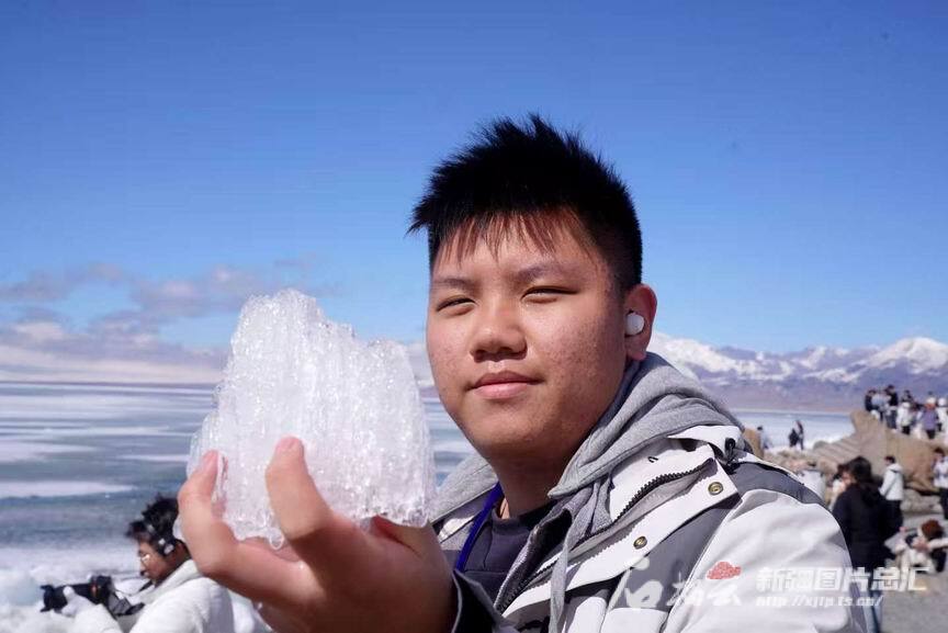 4月20日,一名香港创知中学学生在赛里木湖边拿着一块透明的湖冰留影。石榴云/新疆日报记者 张万德摄