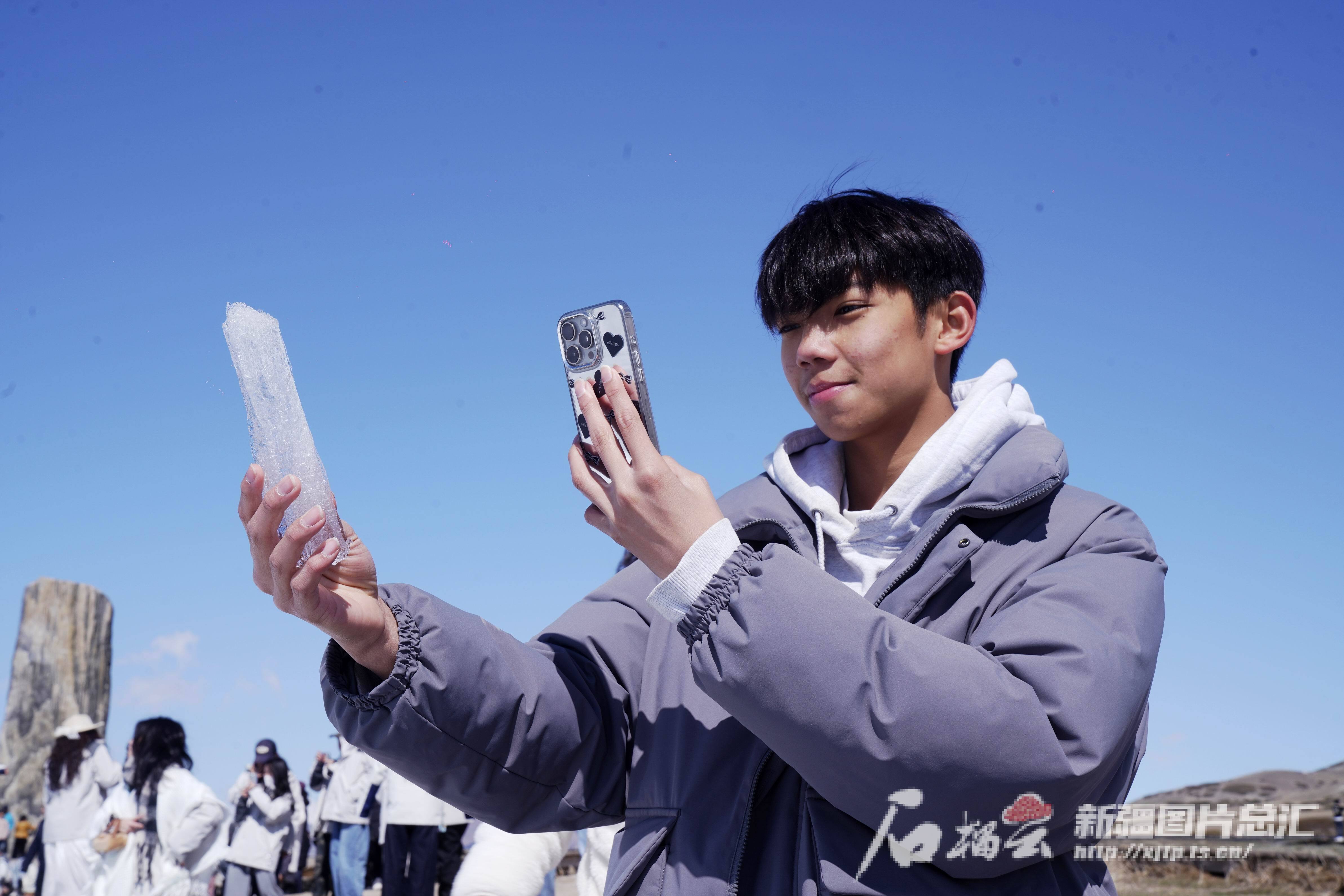 4月20日,一名香港创知中学学生在赛里木湖边拍摄一块透明的湖冰。石榴云/新疆日报记者 张万德摄
