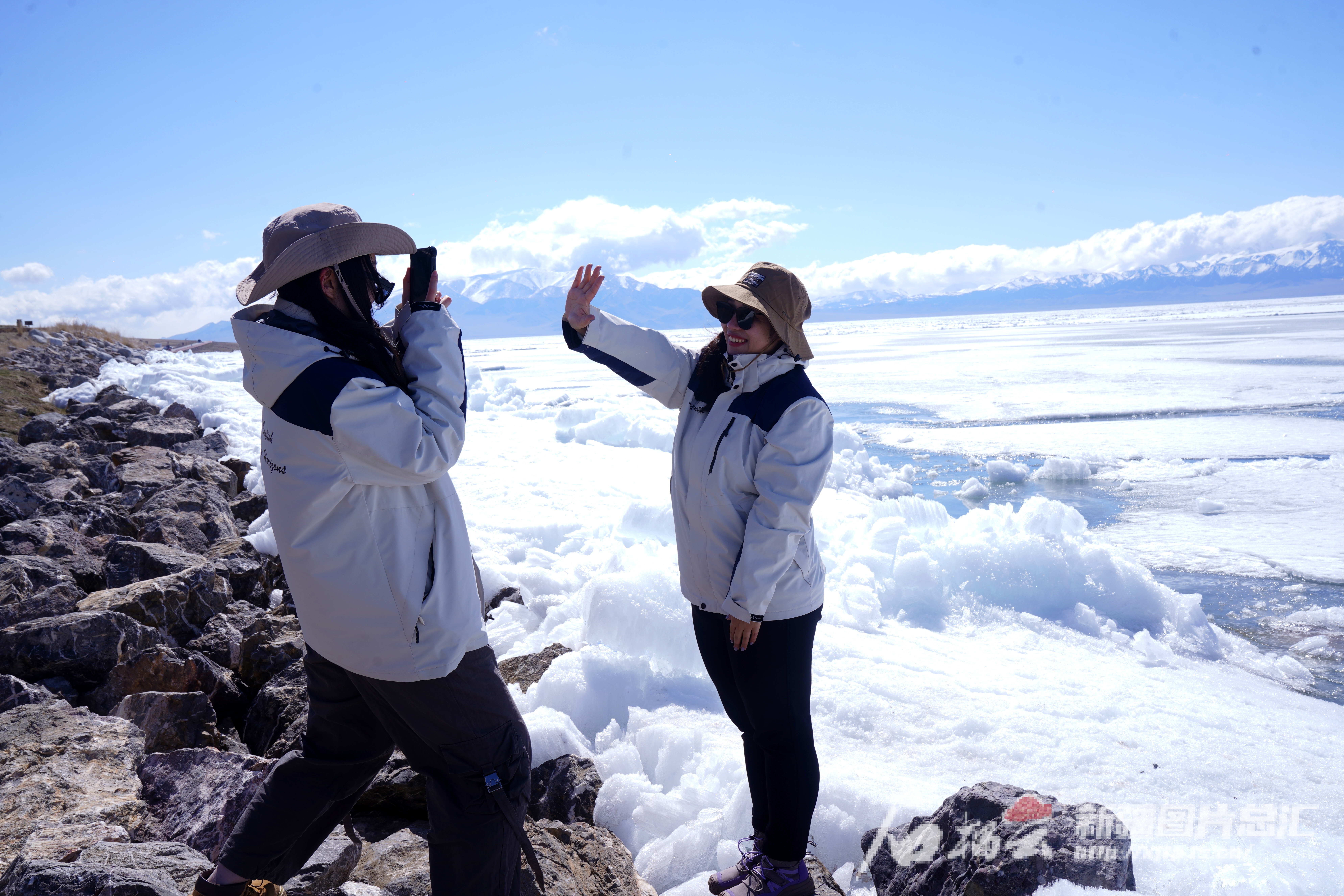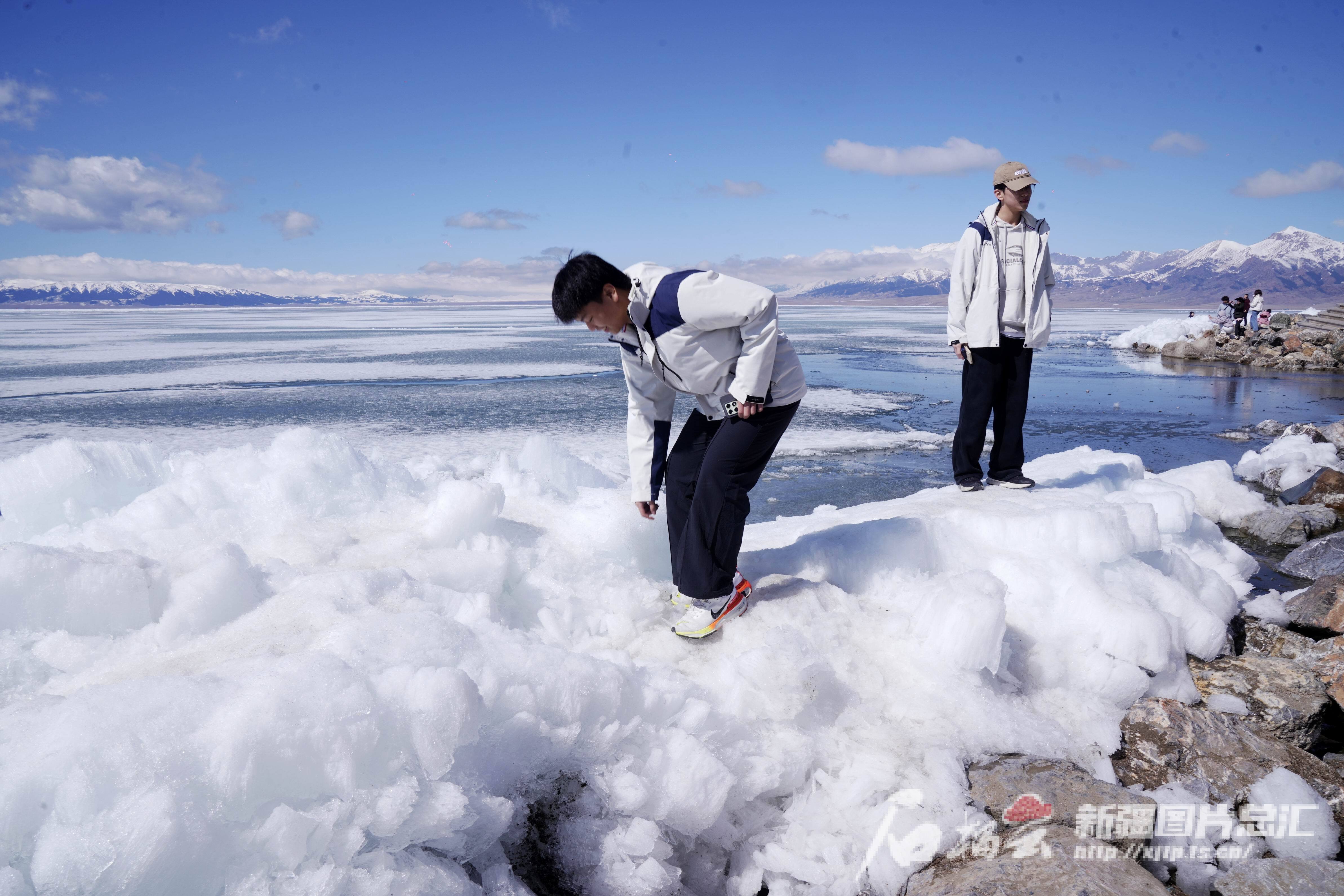 4月20日,在赛里木湖边,来自香港的同学们第一次见到这样洁白透明的湖冰,上前仔细观察、欣赏。石榴云/新疆日报记者 张万德摄