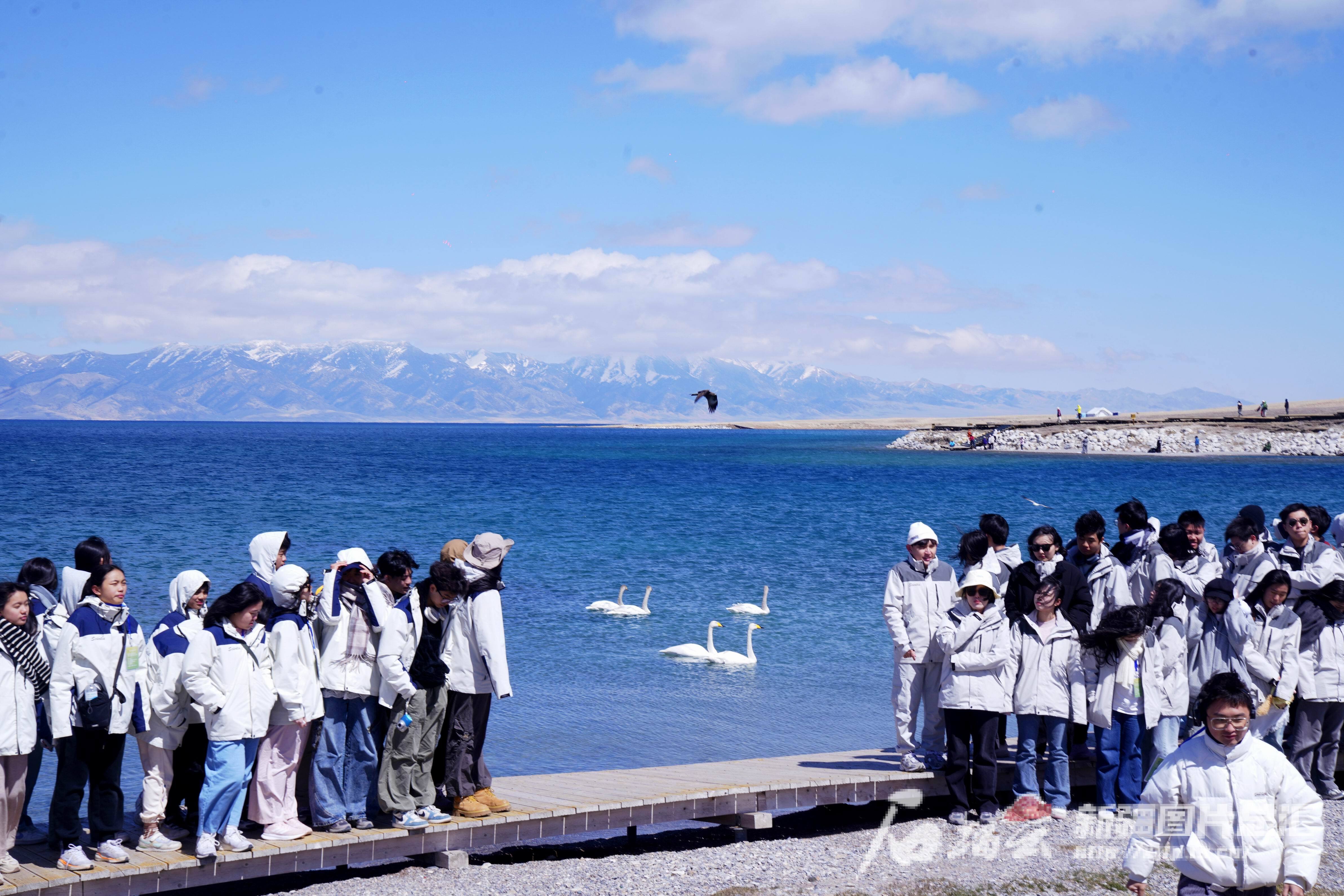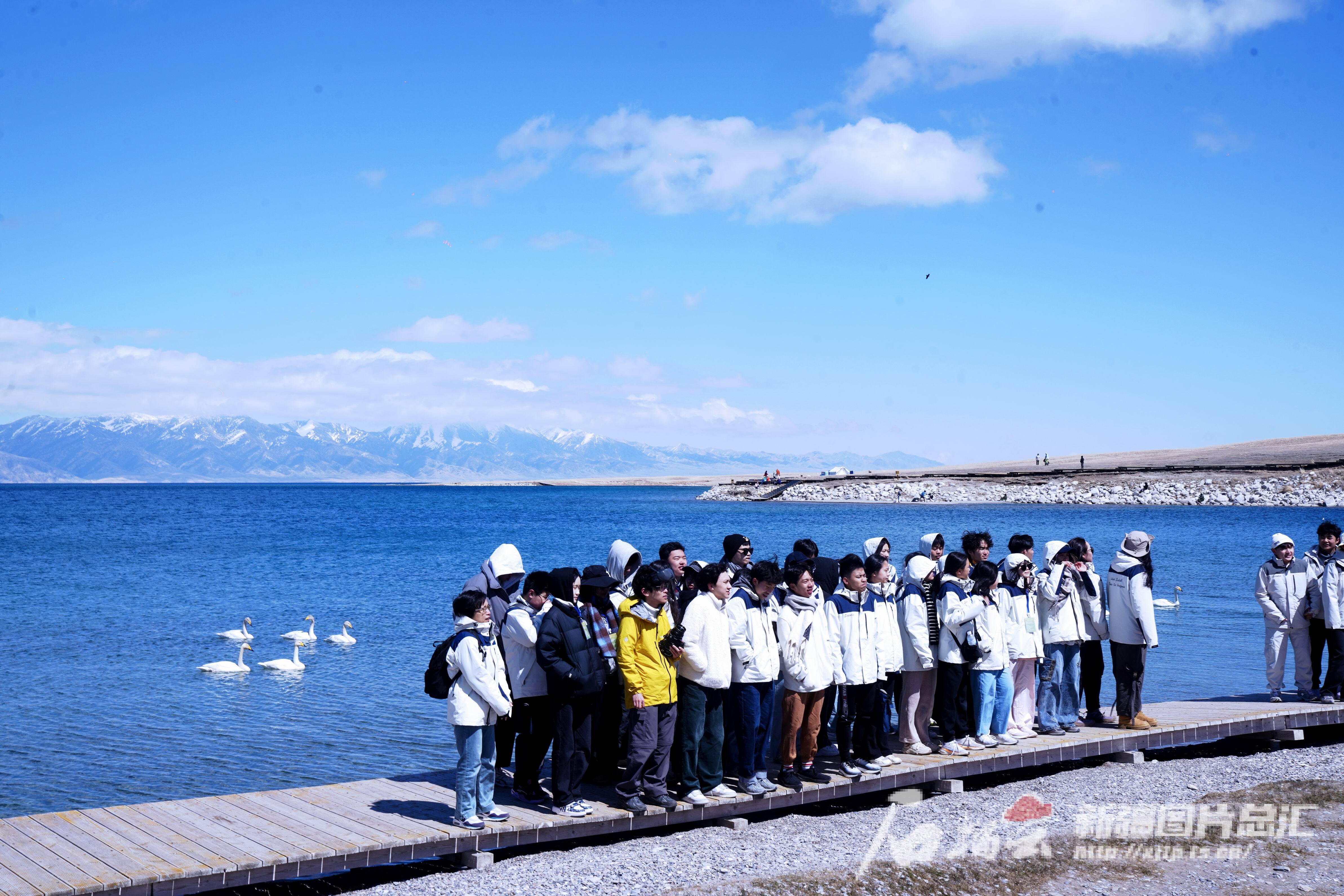 4月20日,同学们在赛里木湖边和雪山、天鹅合影。石榴云/新疆日报记者 张万德摄