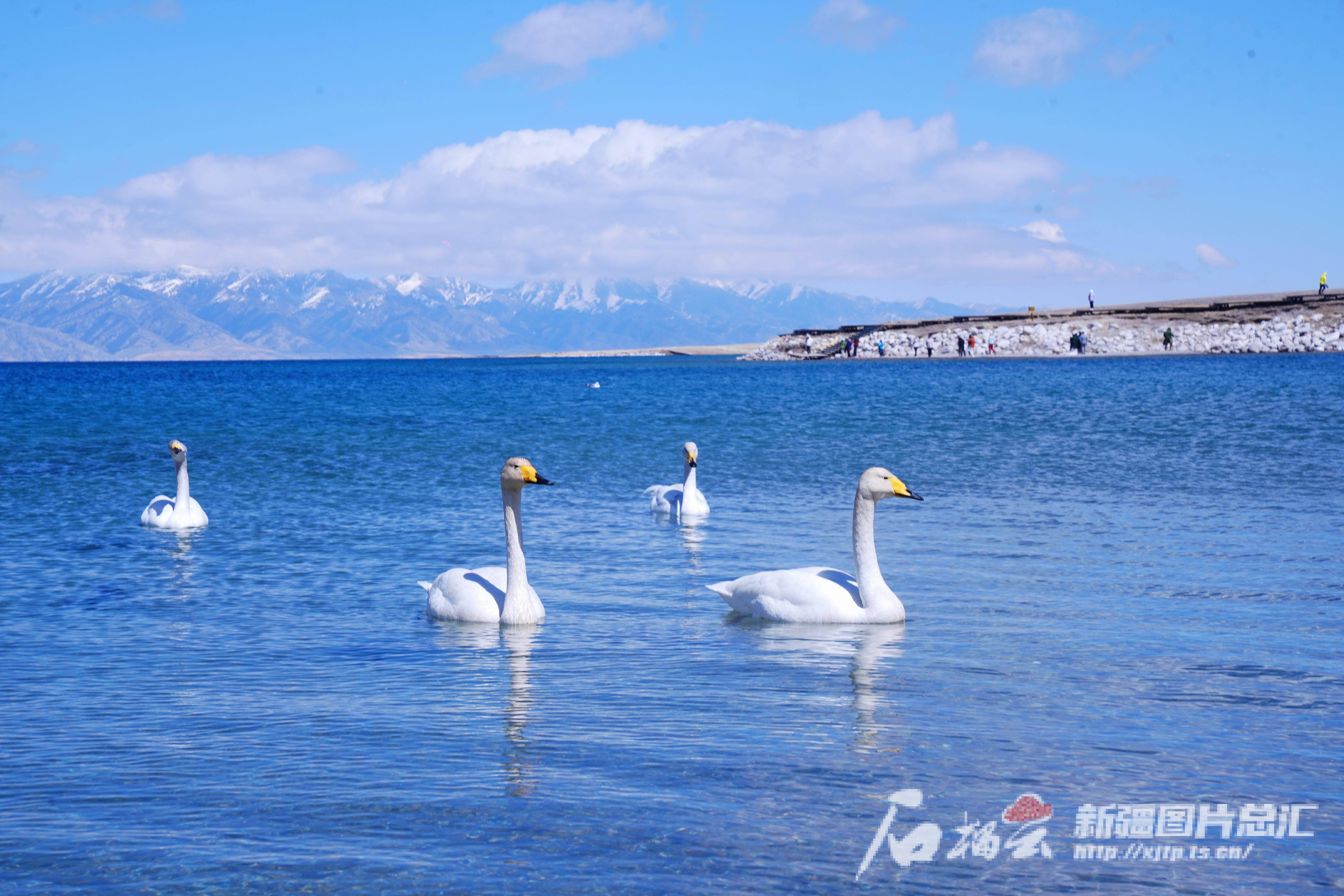 4月20日,赛里木湖里游弋的天鹅。石榴云/新疆日报记者 张万德摄