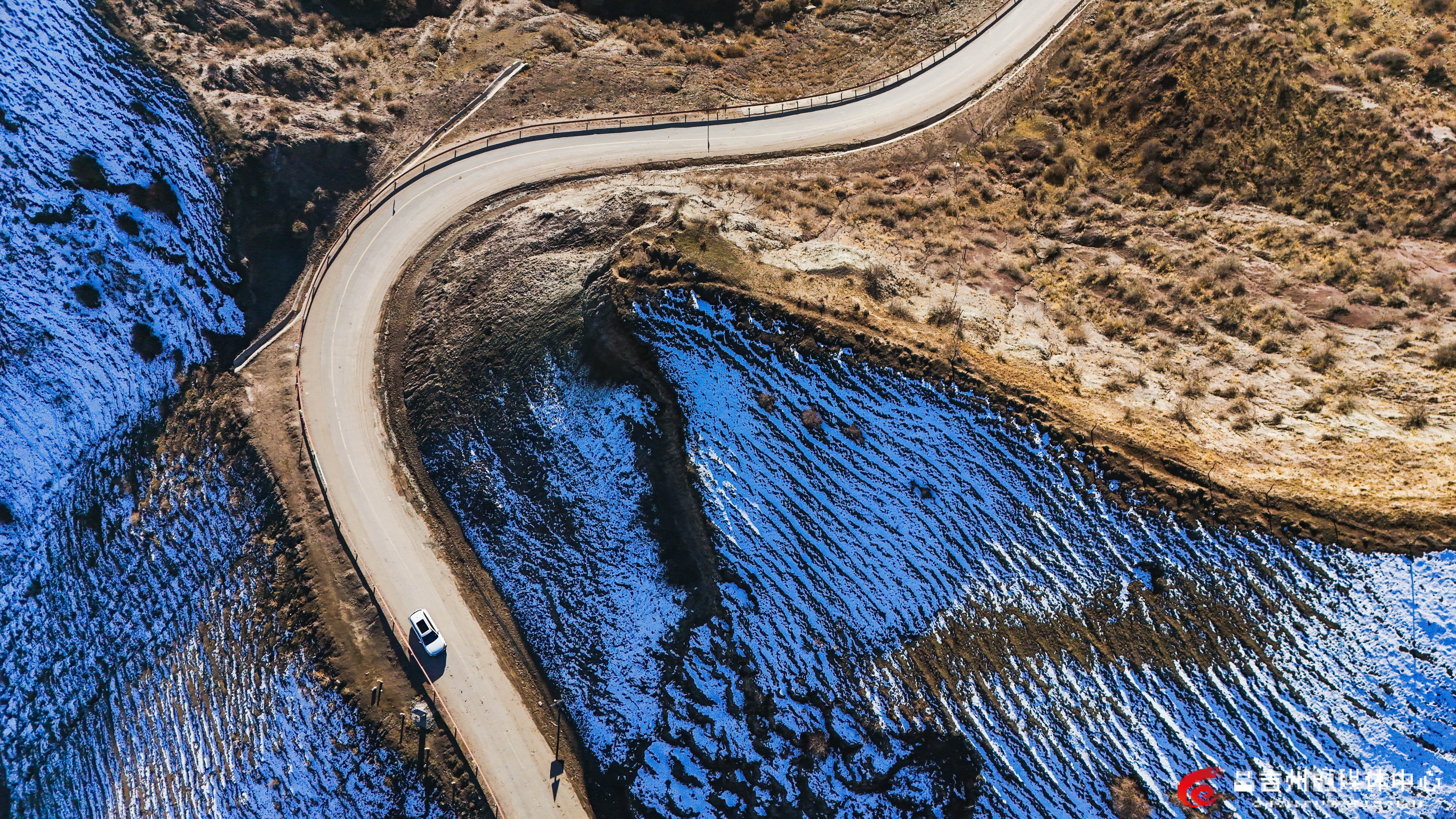 蜿蜒的柏油路与丹霞地貌相映成景,壮美如画。