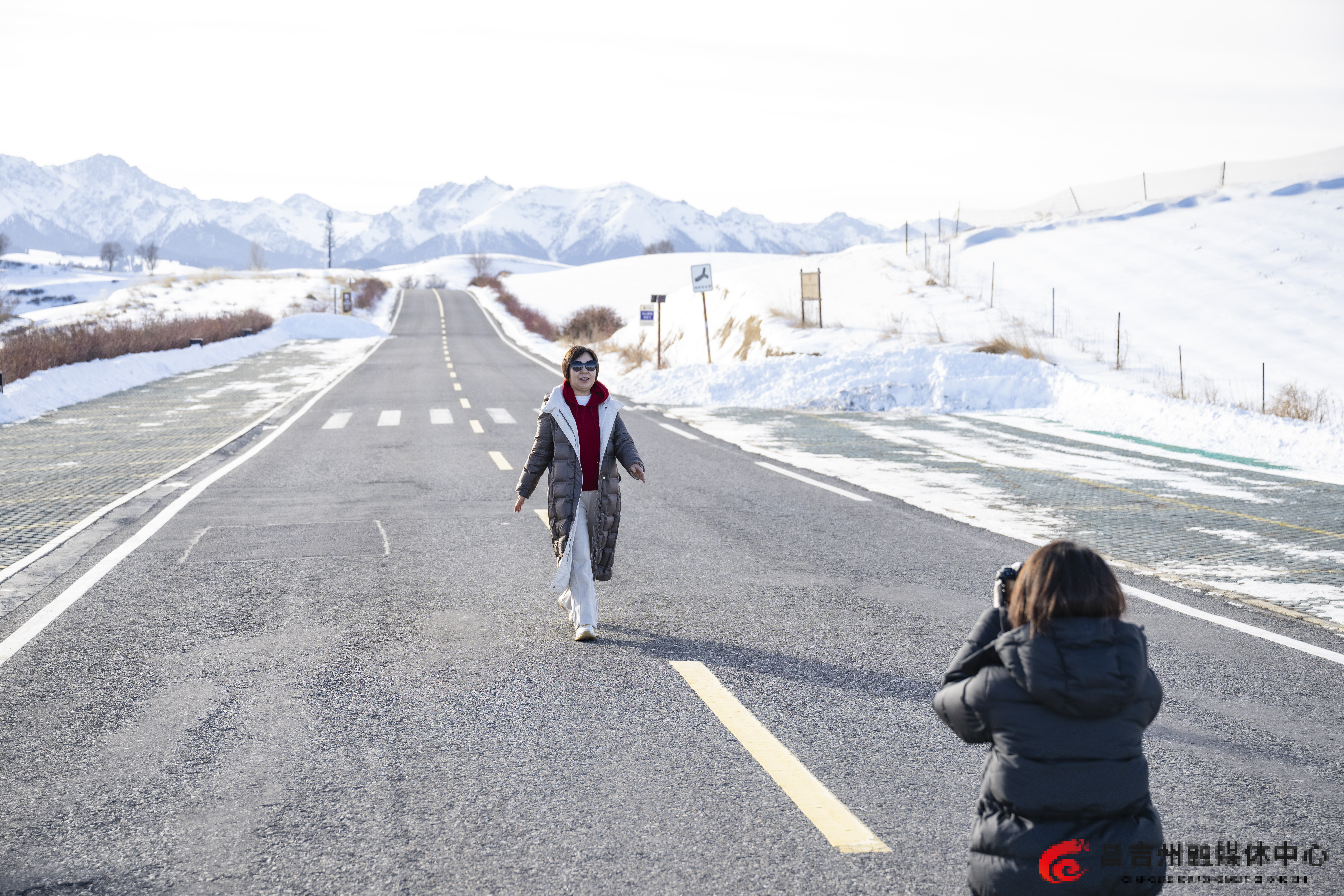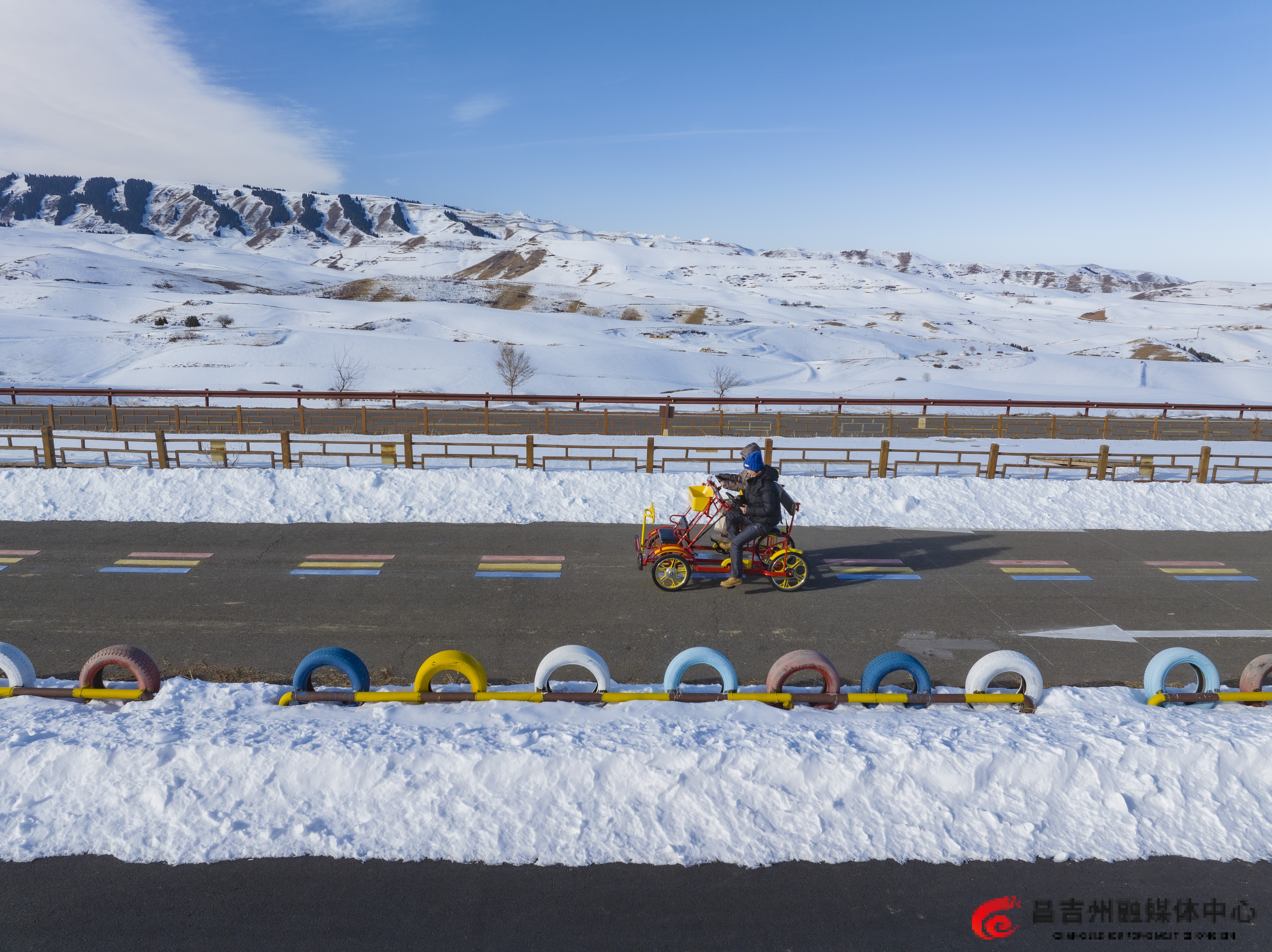 12月7日,在奇台县江布拉克景区,游客在打卡拍照。