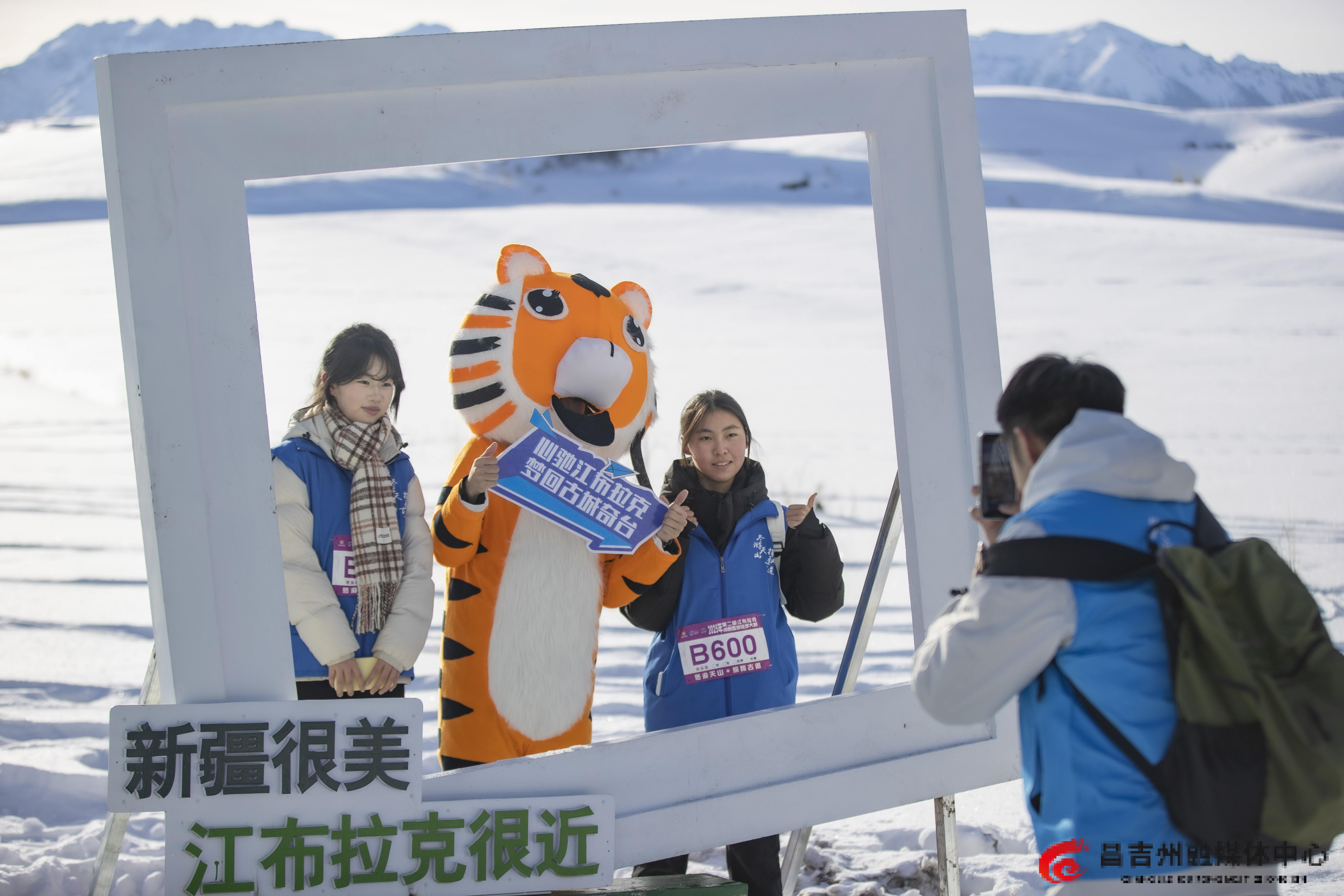 2025年12月28日,“冬游天山·探秘古道”2025年第二届江布拉克冰原雪地徒步大赛开赛。比赛现场,徒步爱好者在景区设立的打卡点拍照打卡。