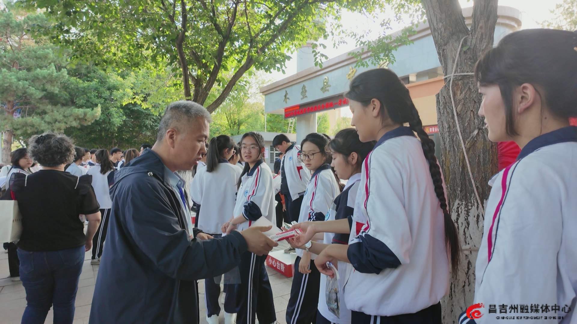 清晨的阳光洒在木垒县中学高中部考点,考生们精神抖擞、意气风发地迈向考场。在等候区域,许多家长身着寓意吉祥的服饰,手持鲜花,为孩子加油鼓劲,眼神中满是关切与期望。老师们也早早来到考点,为学生送上叮嘱和祝福,现场气氛热烈而温馨。