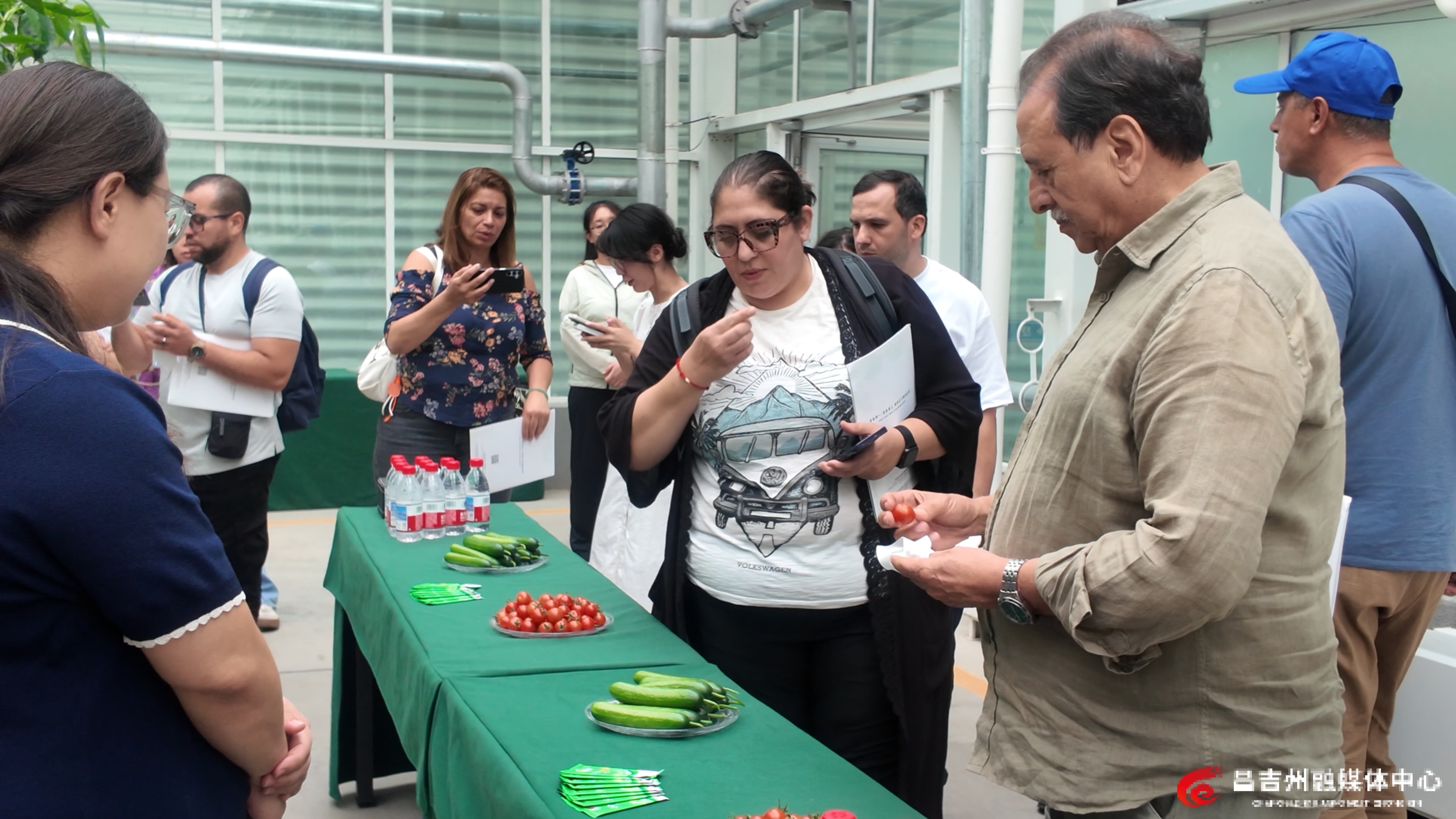 7月27日,阿尔及利亚媒体代表团一行在新疆农业博览园智慧农业科技馆内品尝设施农业大棚蔬菜。记者杨鹤 摄