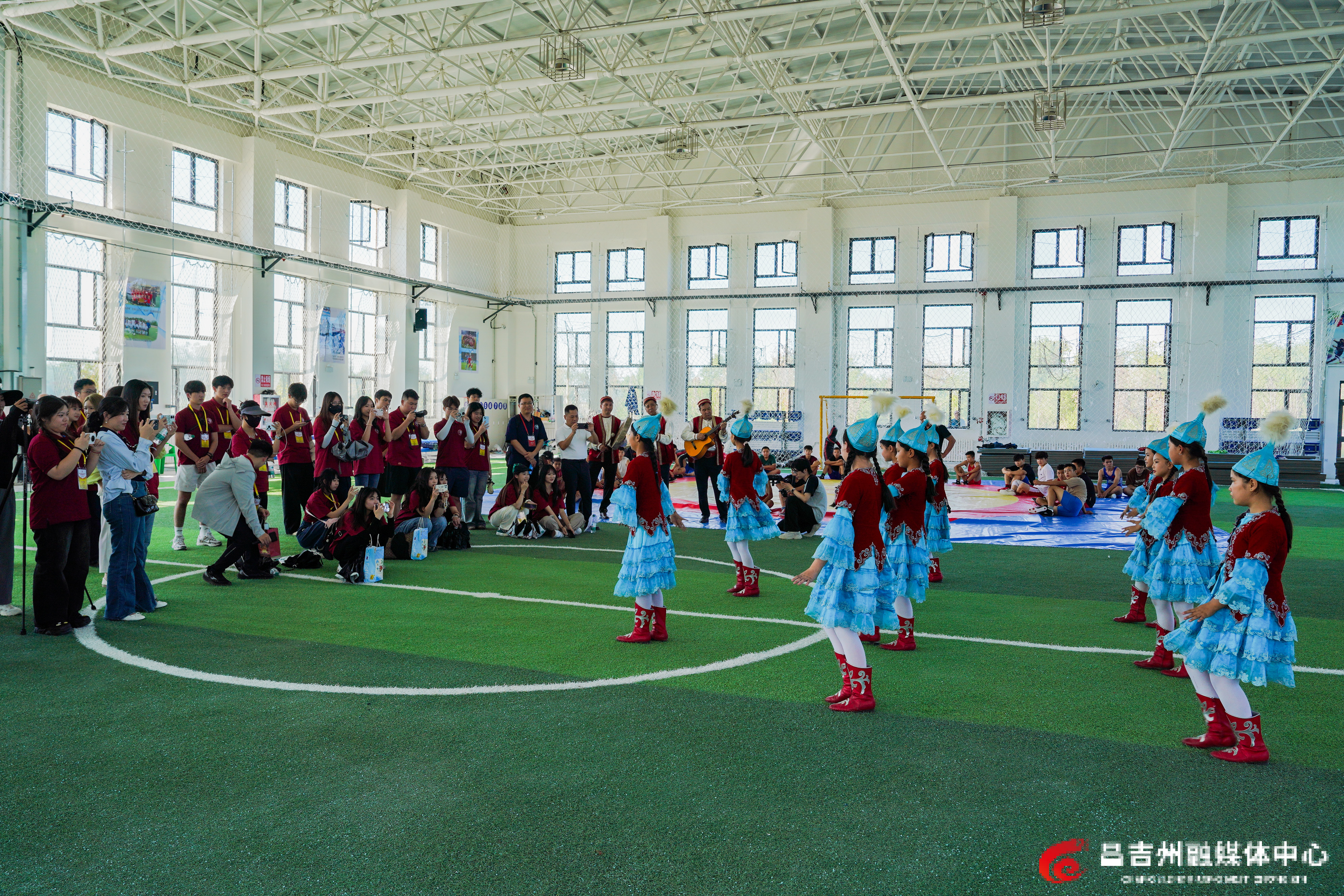 8月6日,参加“泉昌情·心连京·丝路缘——祖国情·中华行”赴新疆(昌吉)研学活动的华侨大学师生在昌吉市阿什里乡中心学校泉州援建体育馆观看学生表演的舞蹈《黑走马》。记者常谊谊 摄