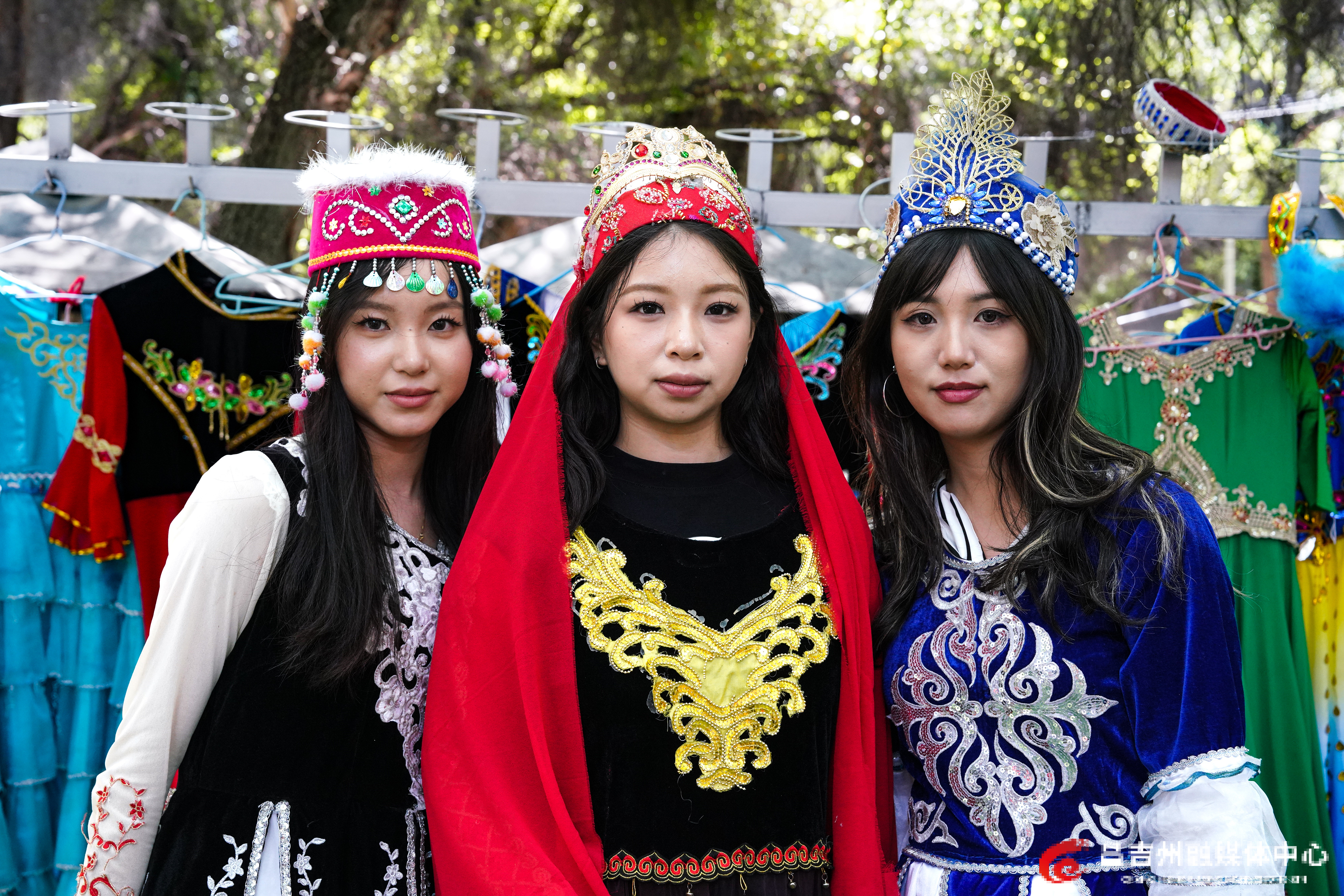 8月10日,参加“泉昌情·心连京·丝路缘——祖国情·中华行”赴新疆(昌吉)研学活动的华侨大学学子在天山天池景区的哈萨克民俗风情园体验传统民族服饰。记者常谊谊 摄