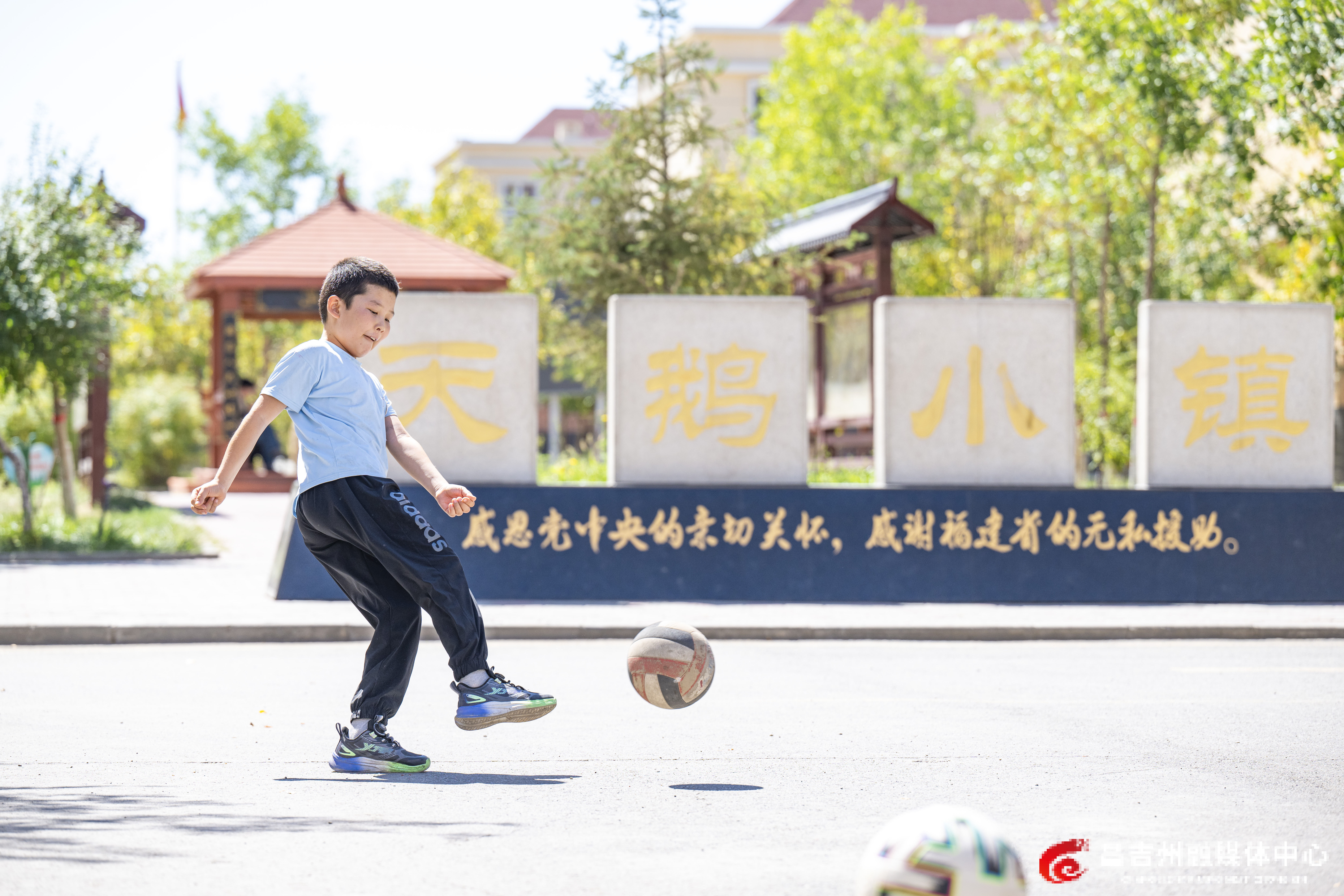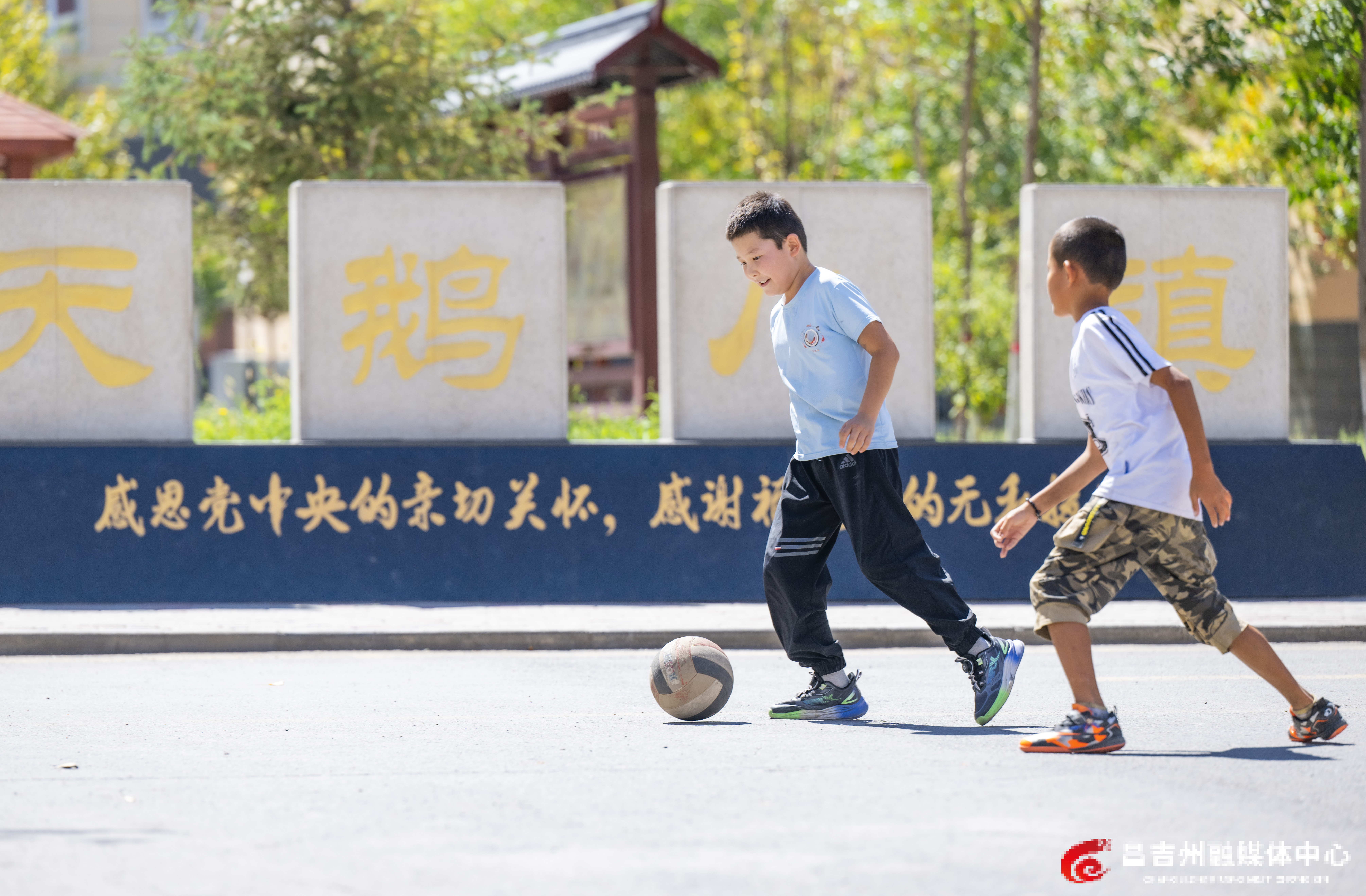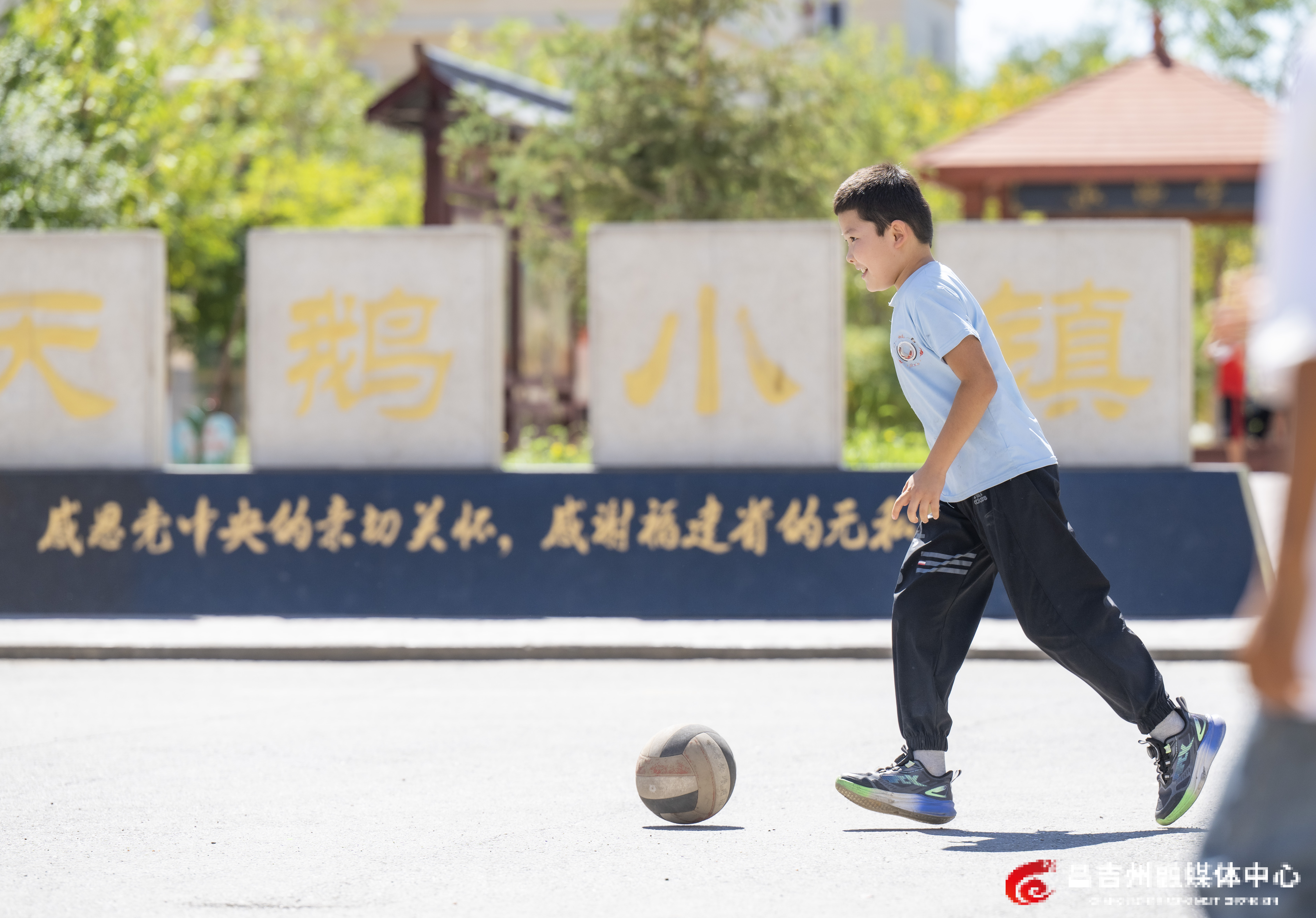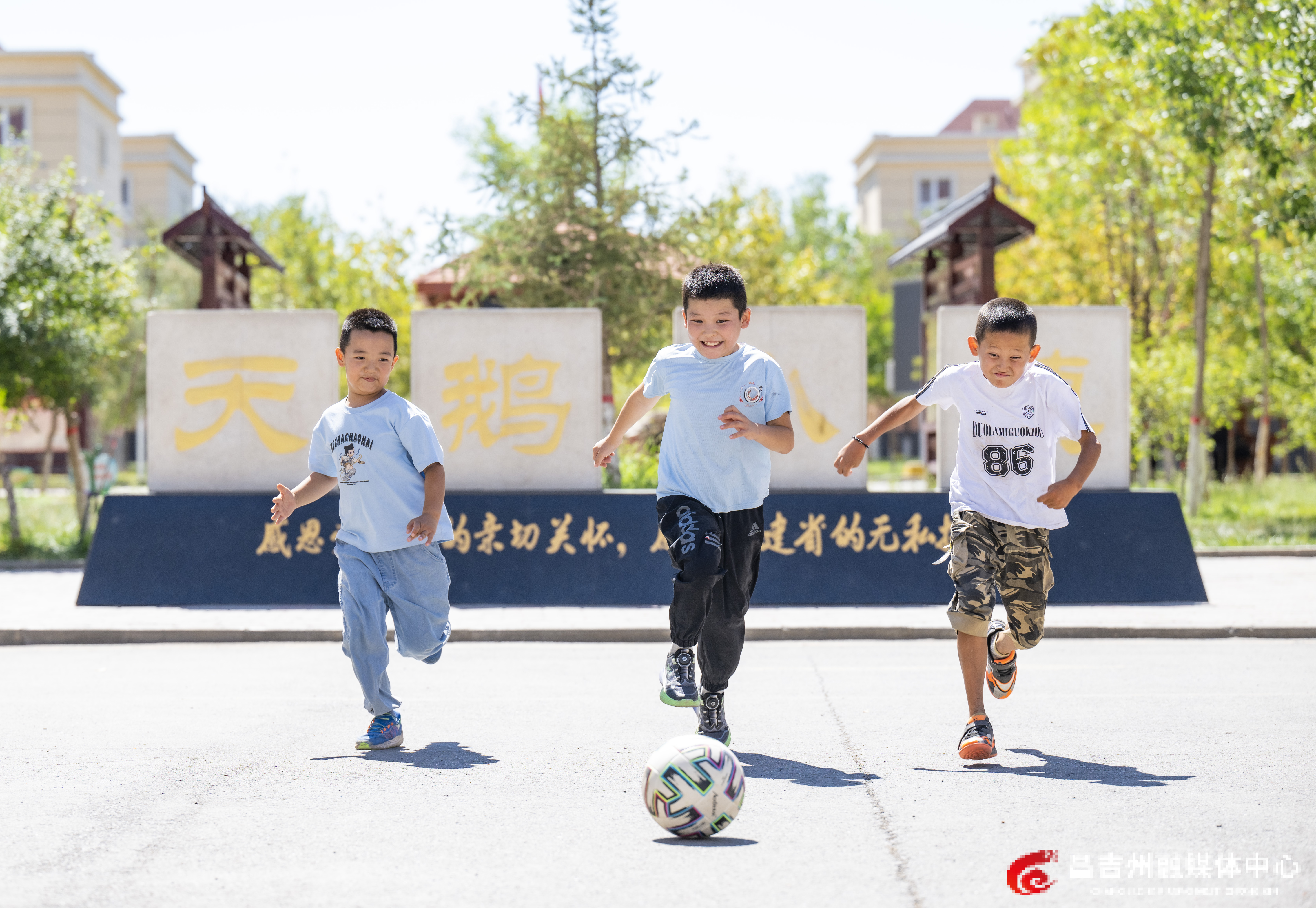 8月26日,昌吉市阿什里乡“天鹅小镇”小区,小朋友在小区里踢足球。