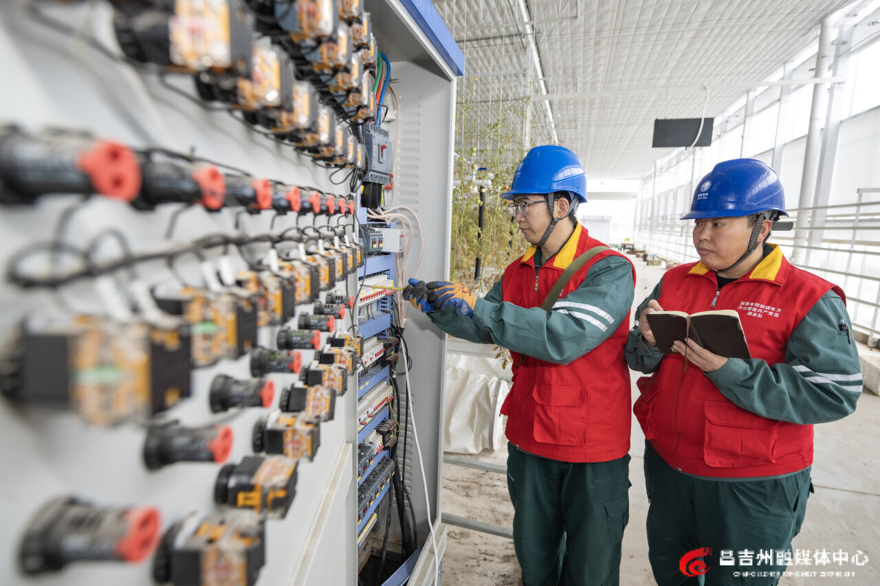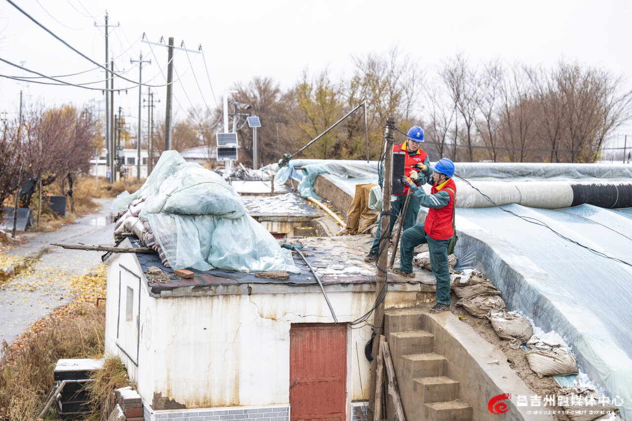 11月6日,昌吉市佃坝镇土梁村设施农业大棚,国网昌吉市供电公司员工在排查用电设备安全隐患。