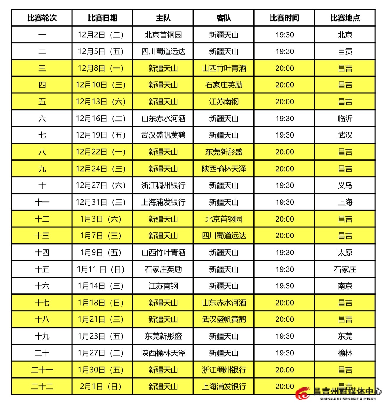 据悉,本赛季新疆天山女篮的11场常规赛主场均设在昌吉体育馆。根据赛程,球队将于本周五(12月5日)前往自贡,客场对阵四川蜀道远达女篮;随后在12月8日第三轮比赛中,新疆队将回归昌吉主场,迎战山西竹叶青酒女篮。