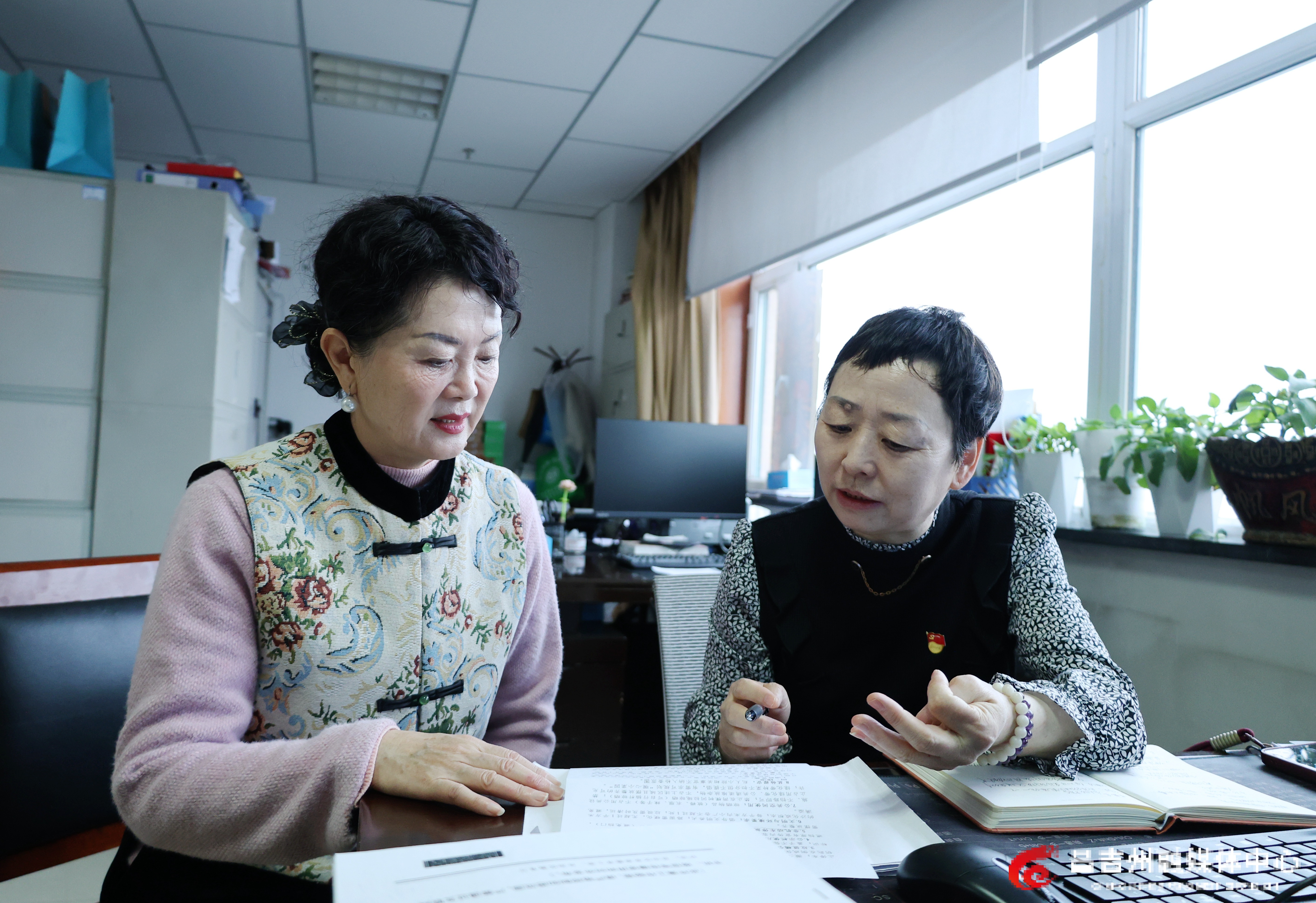 12月20日,在昌吉市委宣传部文明建设科,盛岩(右)在与昌吉市市民文明巡访团骨干成员讨论工作。记者付小芳 摄