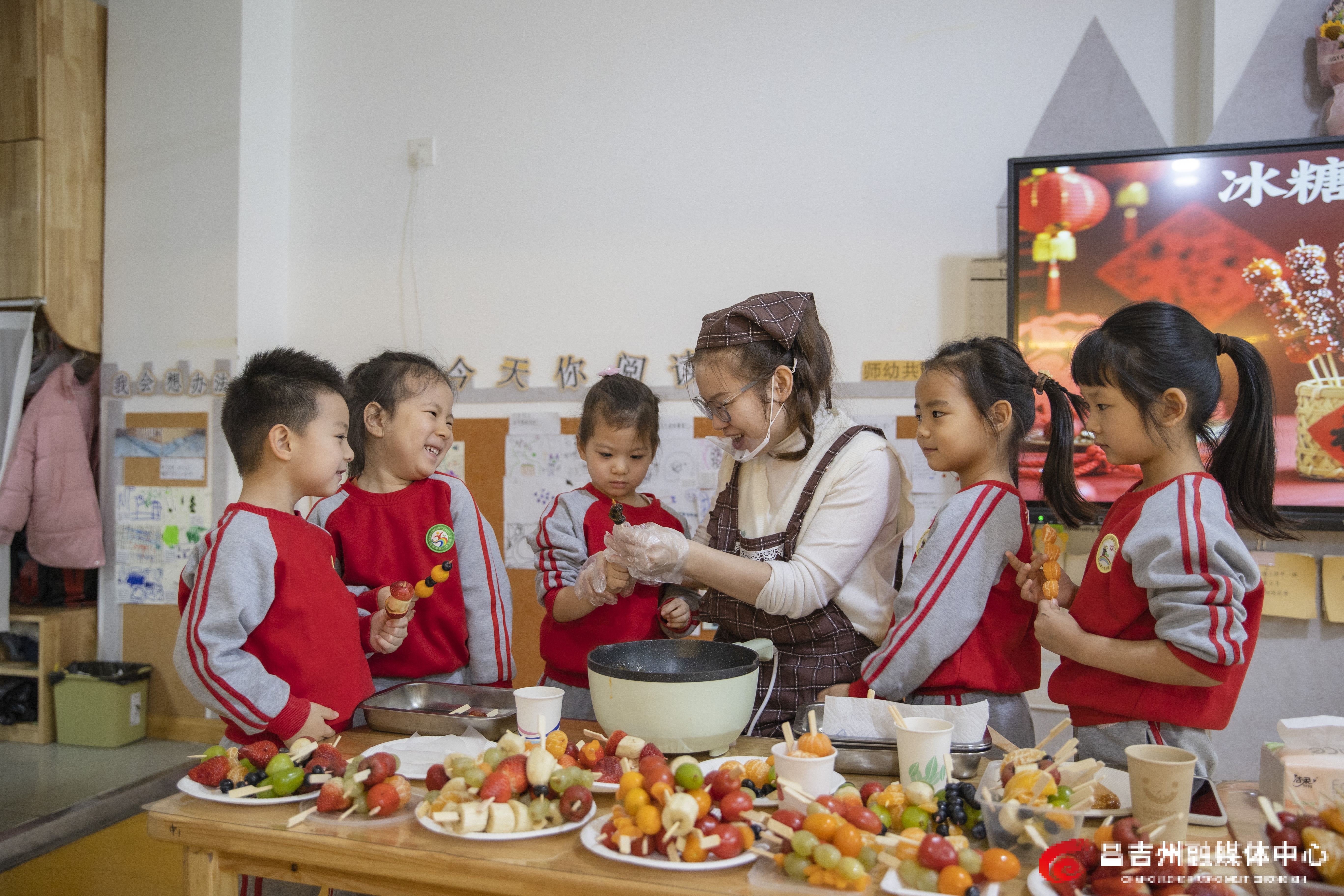 12月19日,在昌吉市第一幼儿园,小朋友在老师的指导下制作冰糖葫芦。当天,昌吉市第一幼儿园开展“暖冬稚趣 品味冬至”系列主题活动。