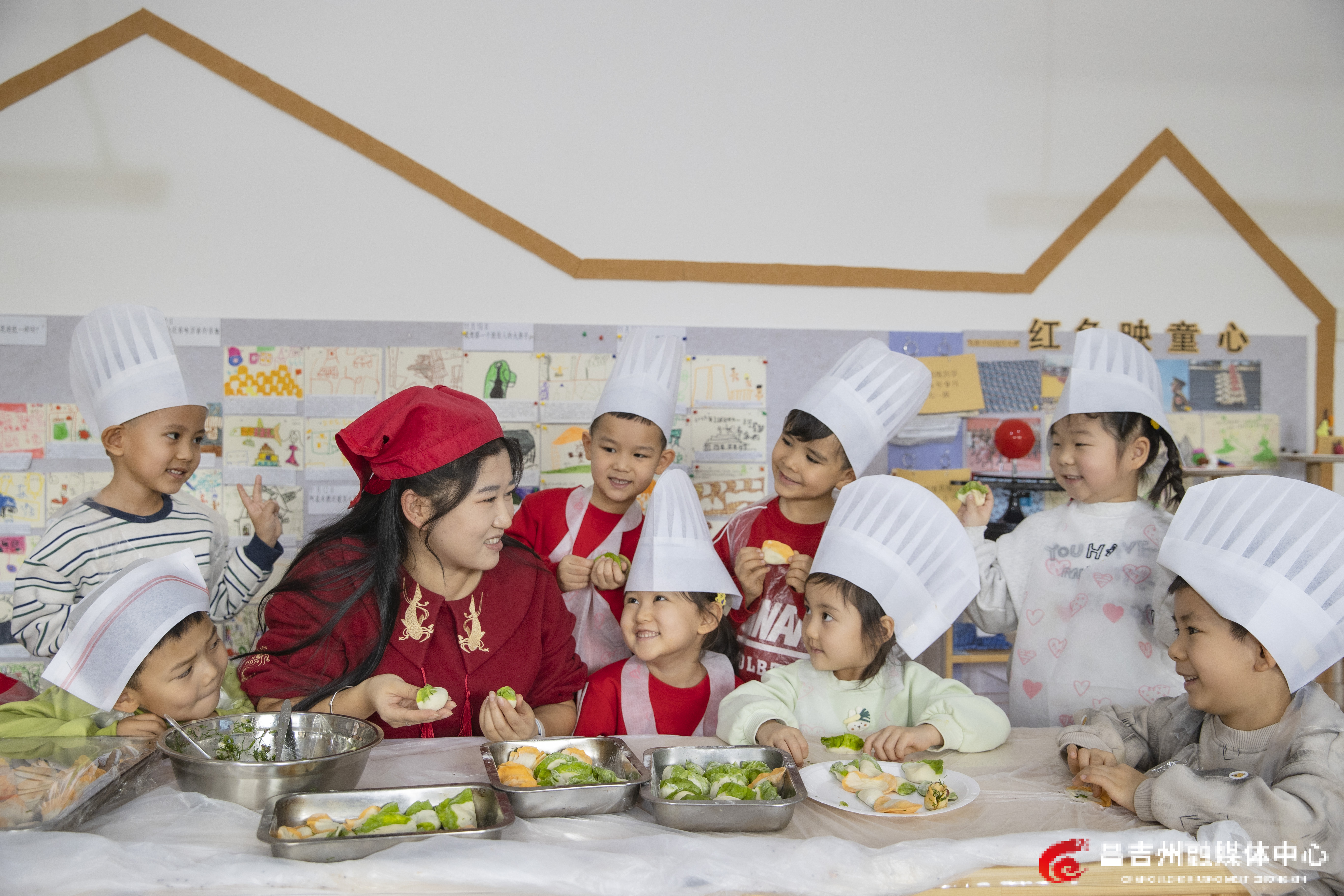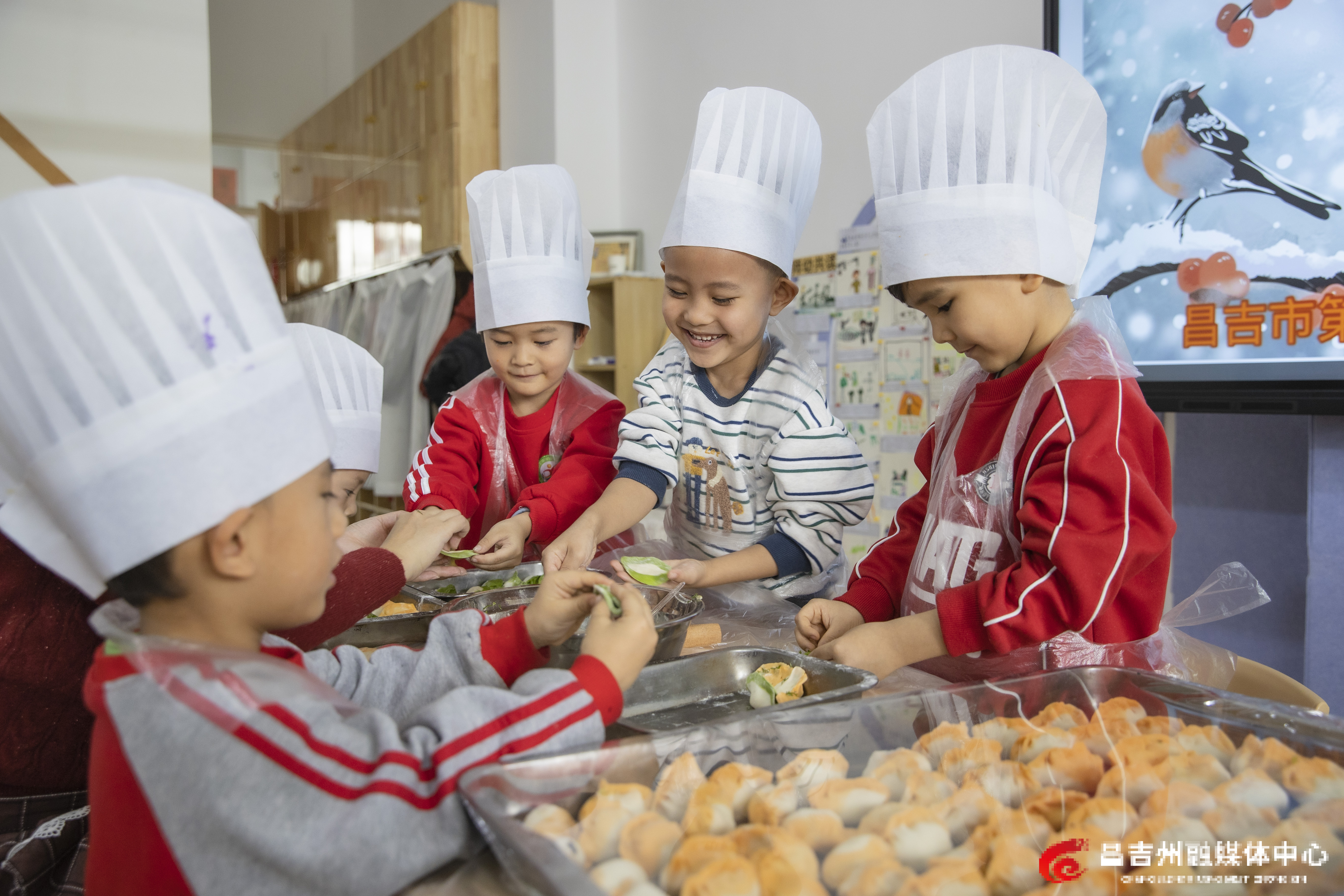 12月19日,在昌吉市第一幼儿园,小朋友在包饺子。当天,昌吉市第一幼儿园开展“暖冬稚趣 品味冬至”系列主题活动。