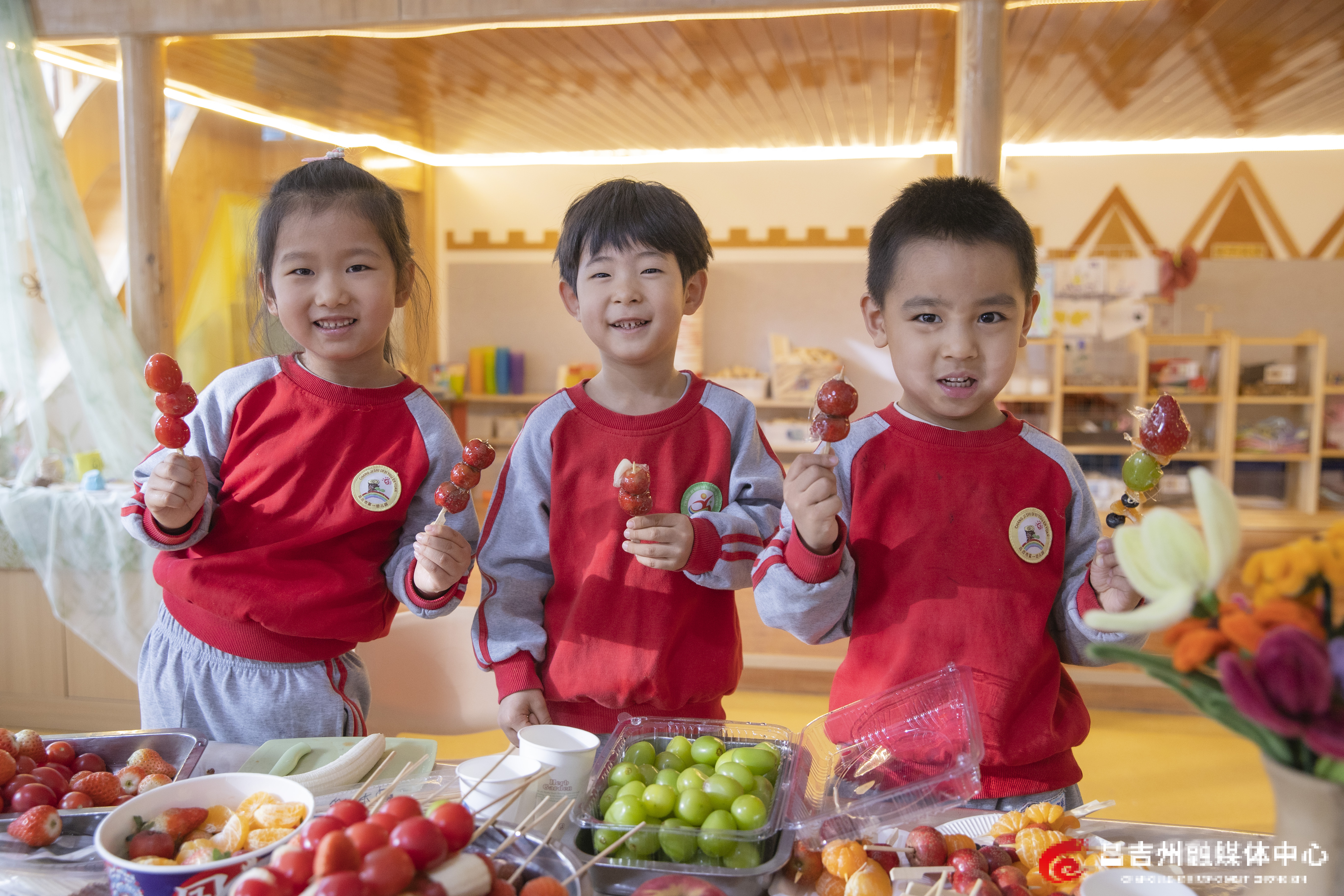 12月19日,在昌吉市第一幼儿园,小朋友在展示自己做的冰糖葫芦。当天,昌吉市第一幼儿园开展“暖冬稚趣 品味冬至”系列主题活动。