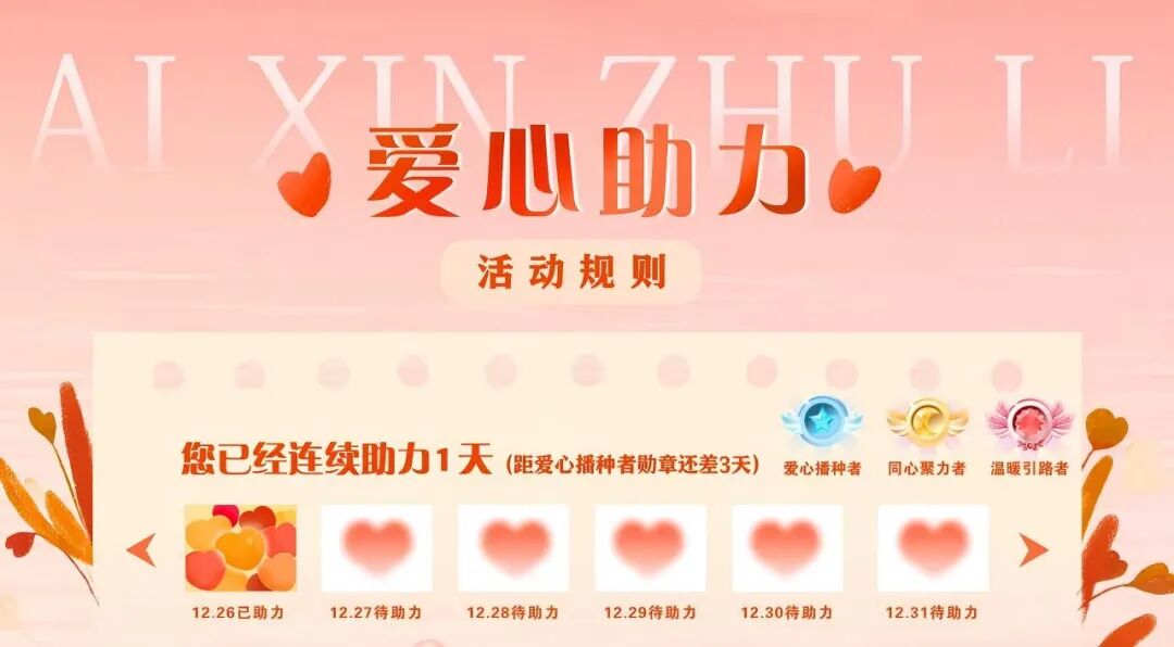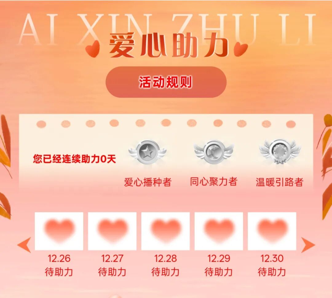 连续打卡满5天,解锁爱心播种者勋章; 连续打卡满10天,解锁同心聚力者勋章; 连续打卡满17天,解锁温暖引路者勋章。