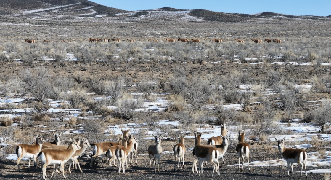 2024年11月13日,在卡拉麦里山有蹄类野生动物自然保护区,近处的国家二级保护动物鹅喉羚和远处的国家一级保护动物蒙古野驴隔林相望。通讯员杨勇 摄