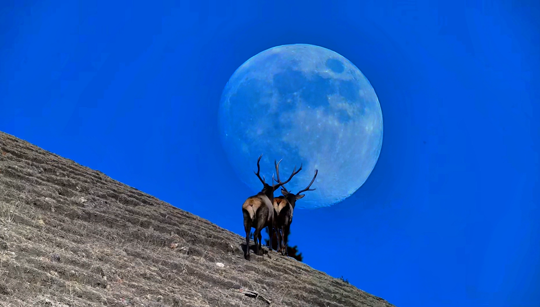 2024年12月14日,在昌吉市江布拉提草原,国家二级保护动物天山马鹿正在月光下悠闲散步。通讯员杨勇 摄