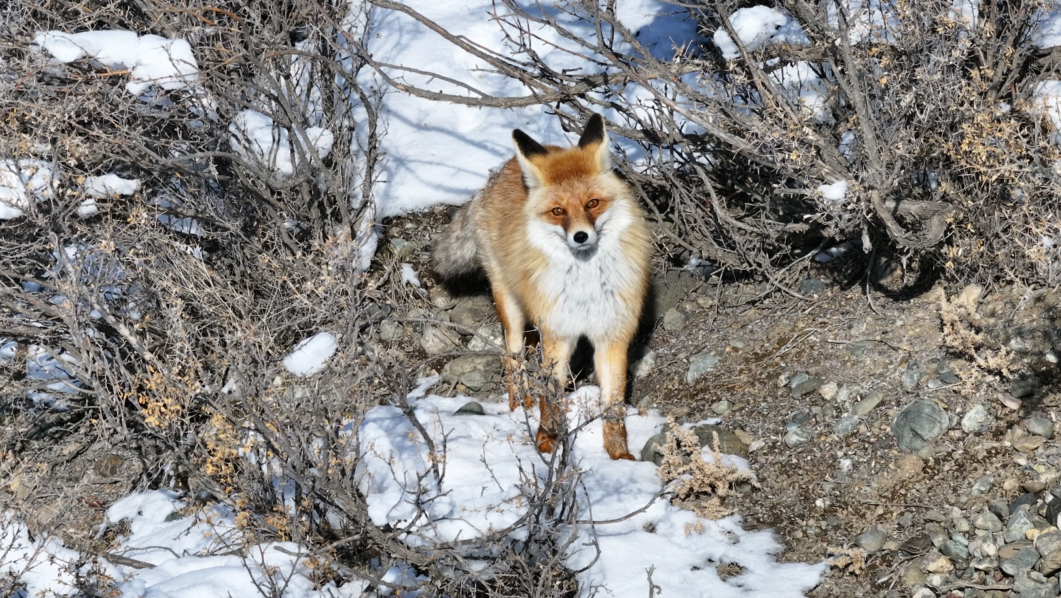 1月24日,在昌吉市索尔巴斯陶风景区,国家二级保护动物赤狐正在山间觅食。记者移志向 摄