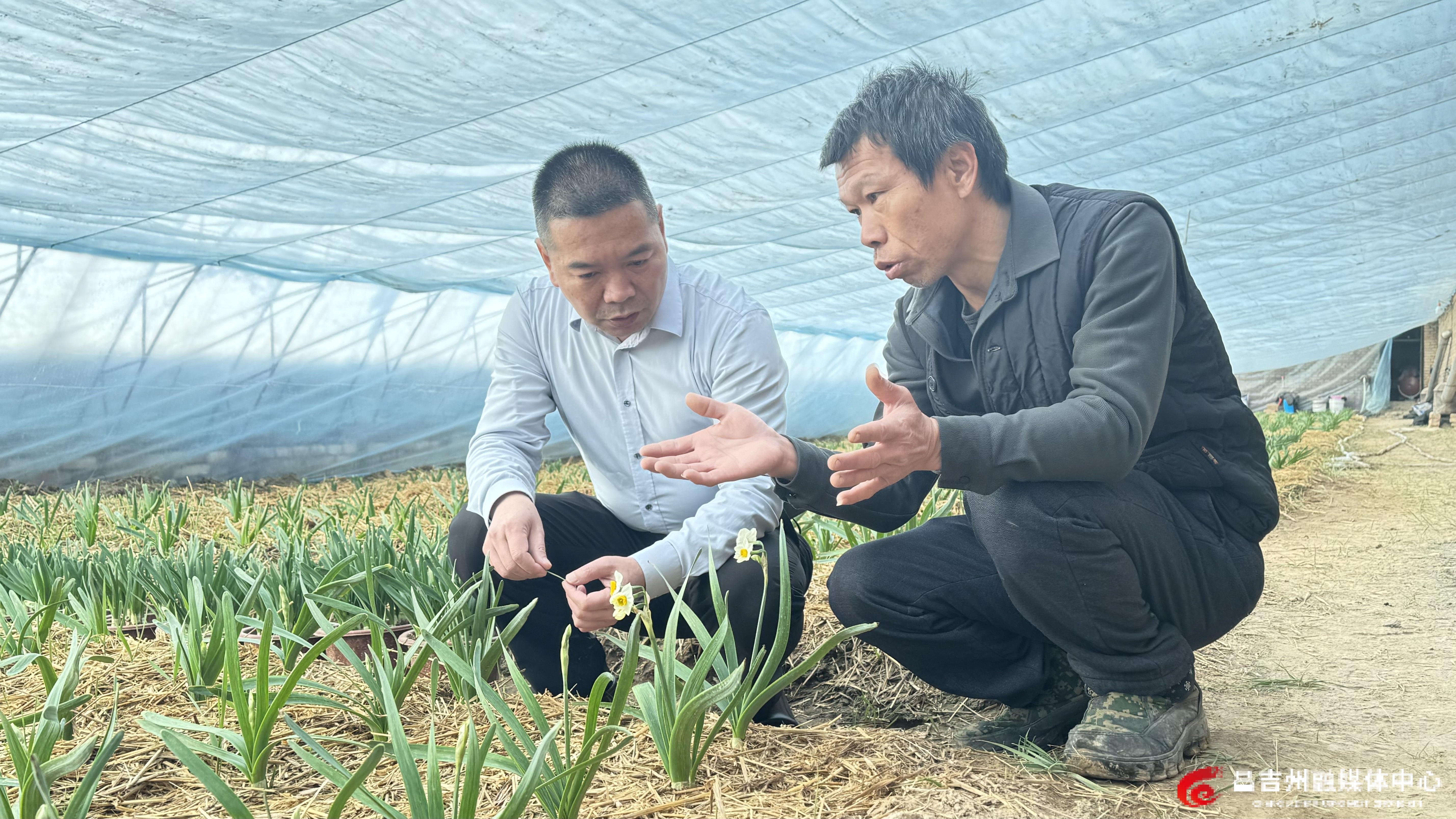 漳州援疆农业技术专家吴剑评和技术人员蔡伟杰一同察看水仙花长势。通讯员吴跃彬 摄