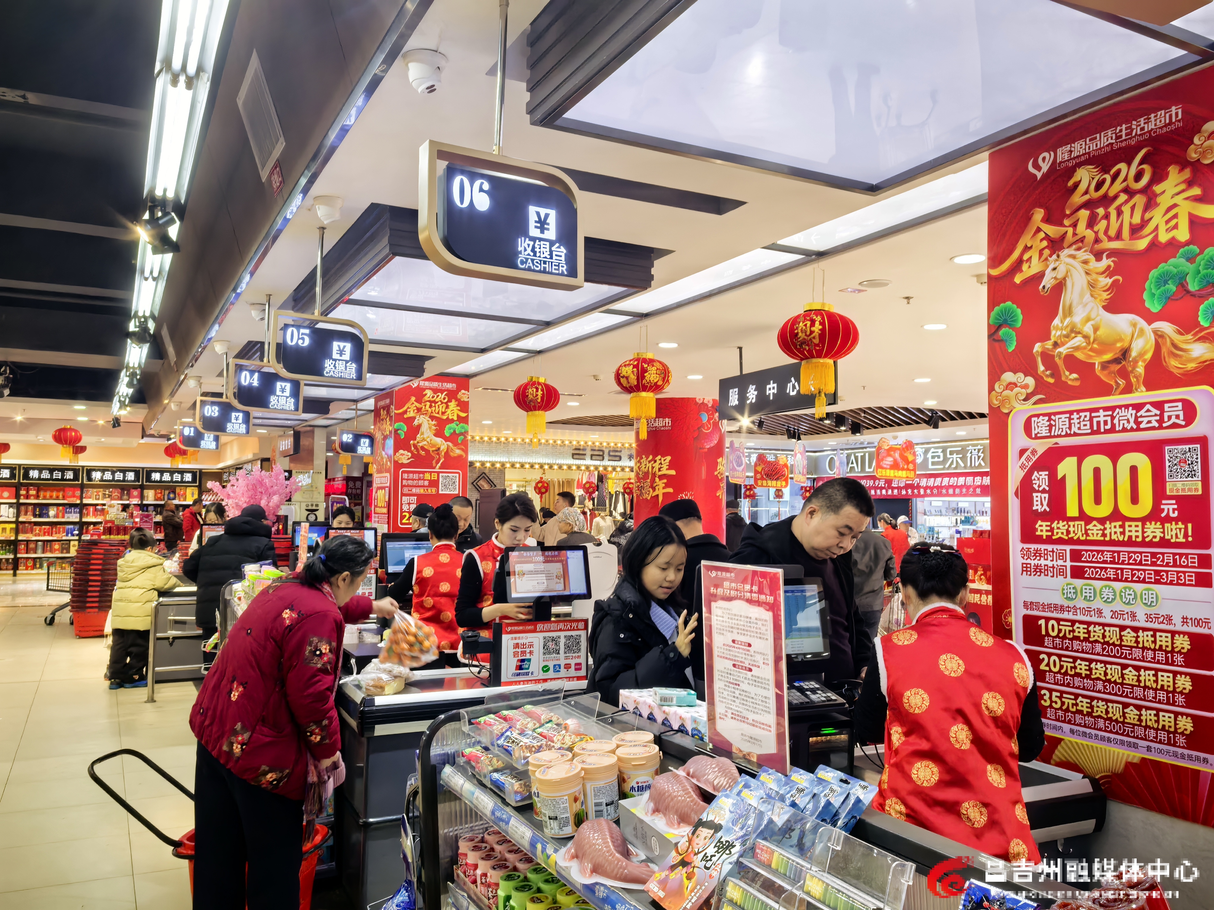 A+ A. A-丝路昌吉/昌吉州融媒体中心讯(记者 米桃乐 通讯员 吕振江报道)随着马年春节的脚步日益临近,昌吉市各大商超、农贸市场的年味越来越浓。1月30日,记者在昌吉市隆源超市看到,货架上粮油米面堆放整齐,生鲜蔬果色泽鲜亮,肉禽蛋奶新鲜足量,糖果酒水、休闲零食等年货一应俱全,成群的市民推着购物车穿梭其间,精心挑选年货,收银台前排起了结账的市民长队。