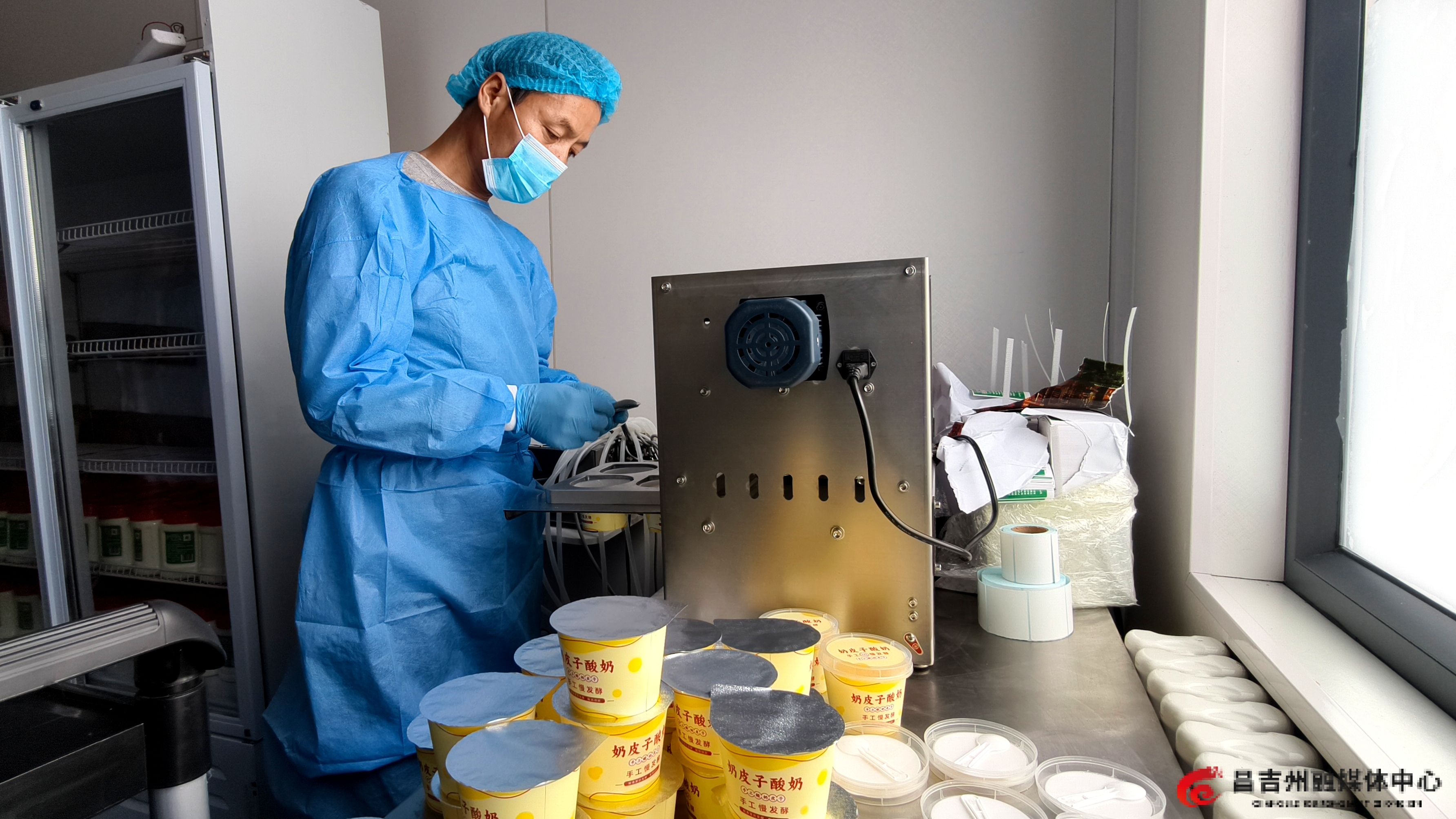 纯手工酸奶、奶皮子酸奶、无糖酸奶、干奶皮4款主打产品整齐陈列在包装间的冷藏柜里,工人们有条不紊地为酸奶封盖、打包,全力为春节市场备货。