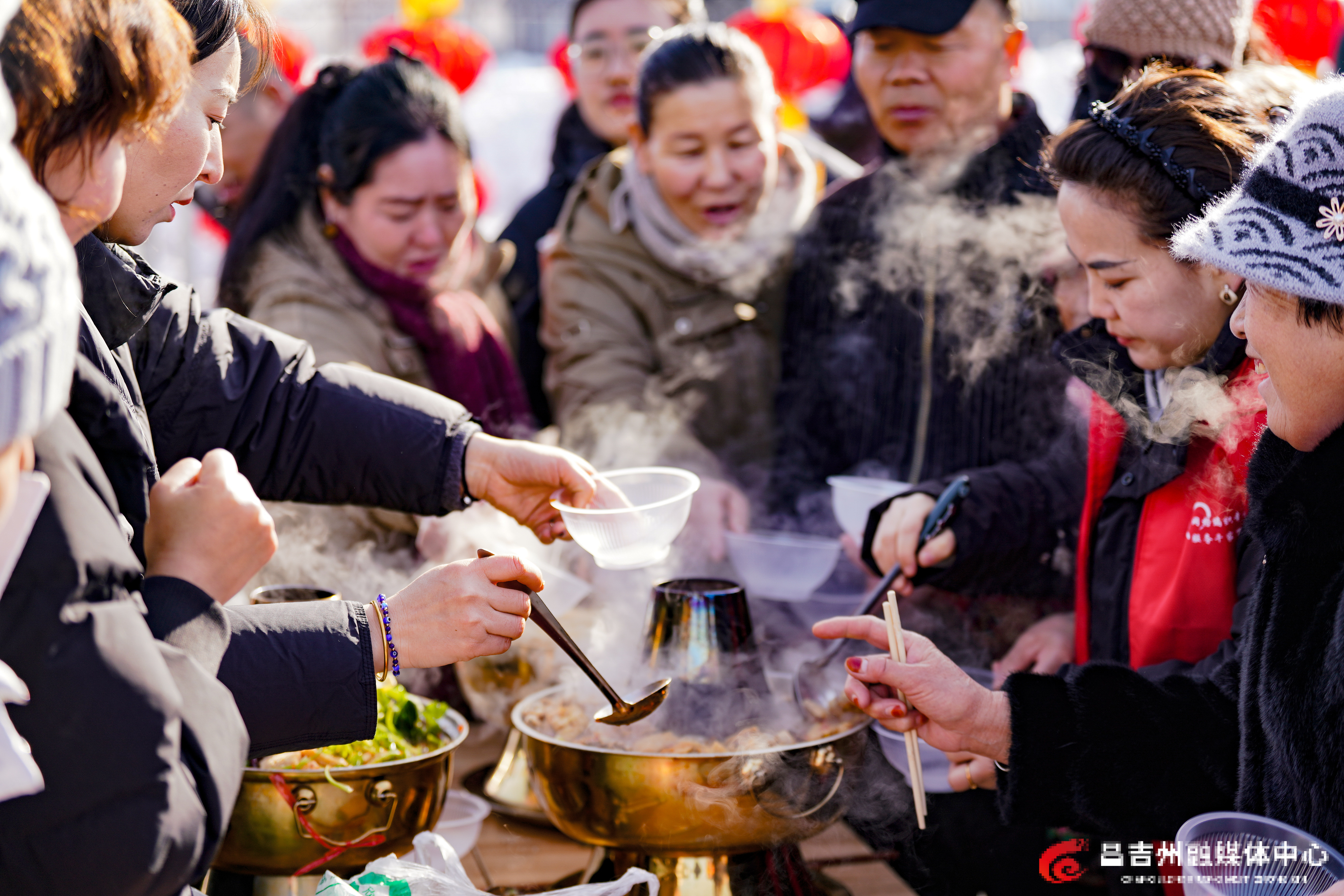 2月10日,农历北方小年,木垒县新户镇年货大集上,群众正品尝免费的土火锅。