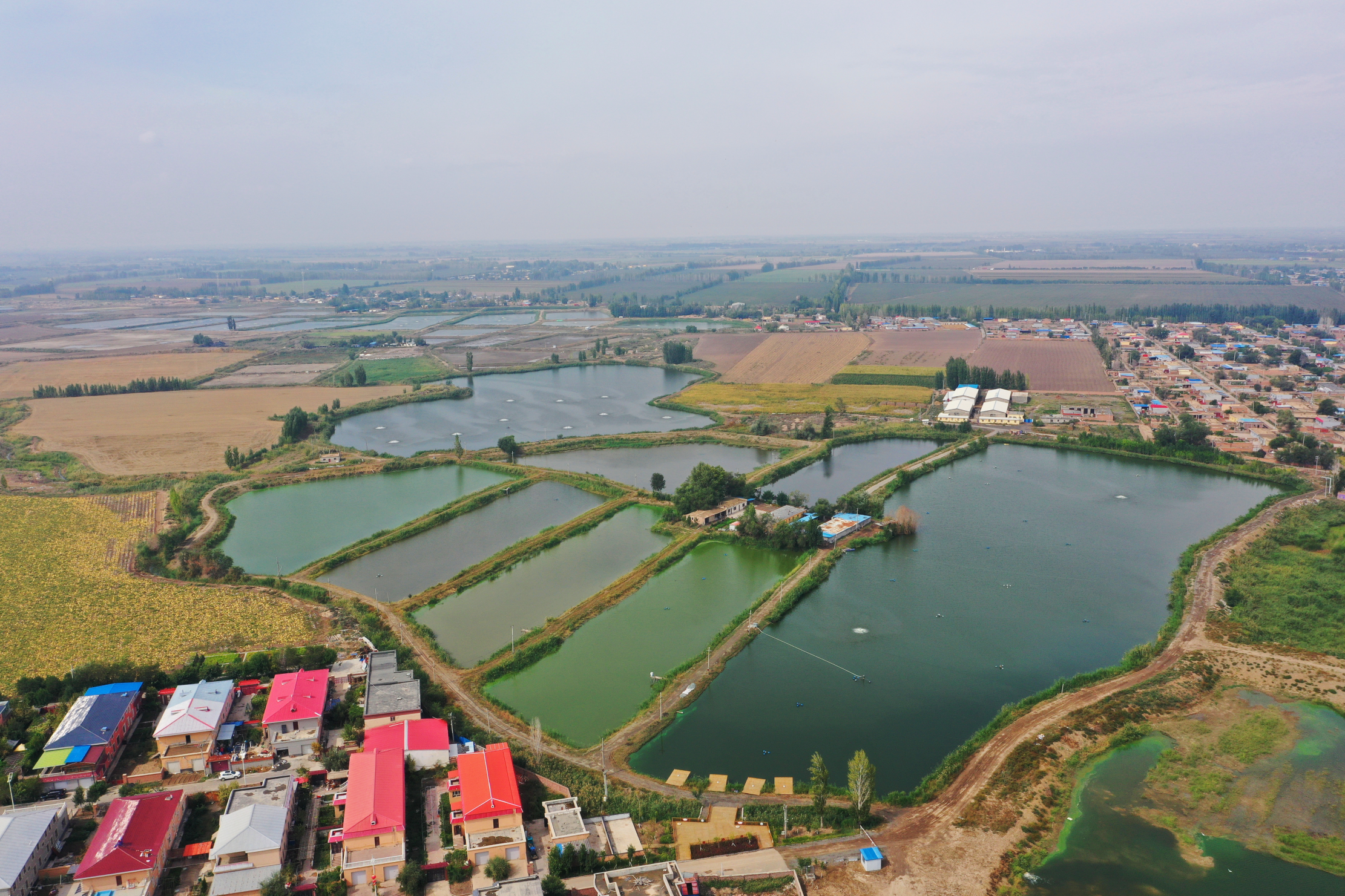 2025年8月11日,昌吉市六工镇十三户村养殖鱼塘航拍。刘华摄