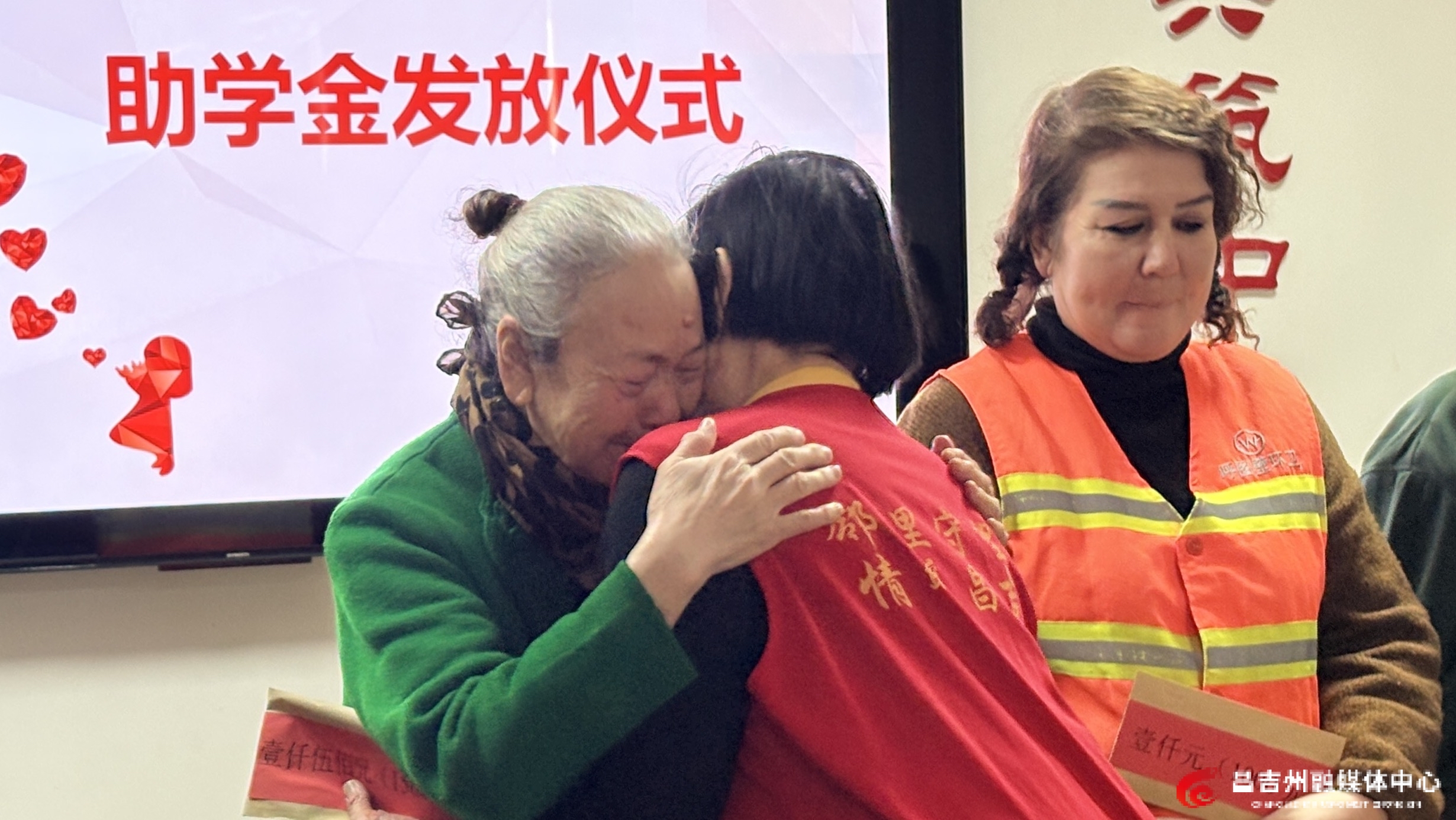 3月4日,阿同汗志愿服务队助学金发放仪式上,艾比拜(左一)与王桂珍相拥。实习记者闫婧雯 摄