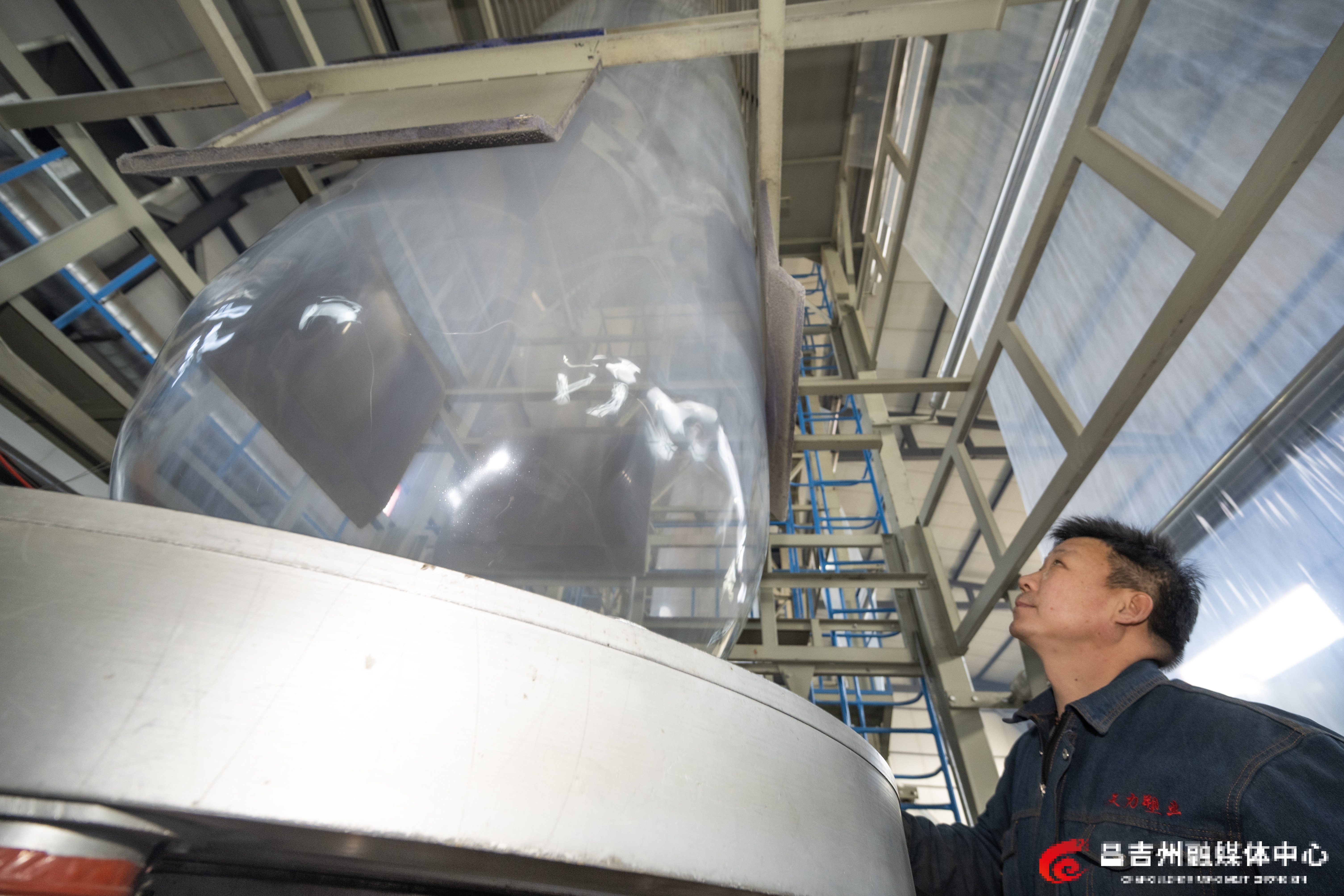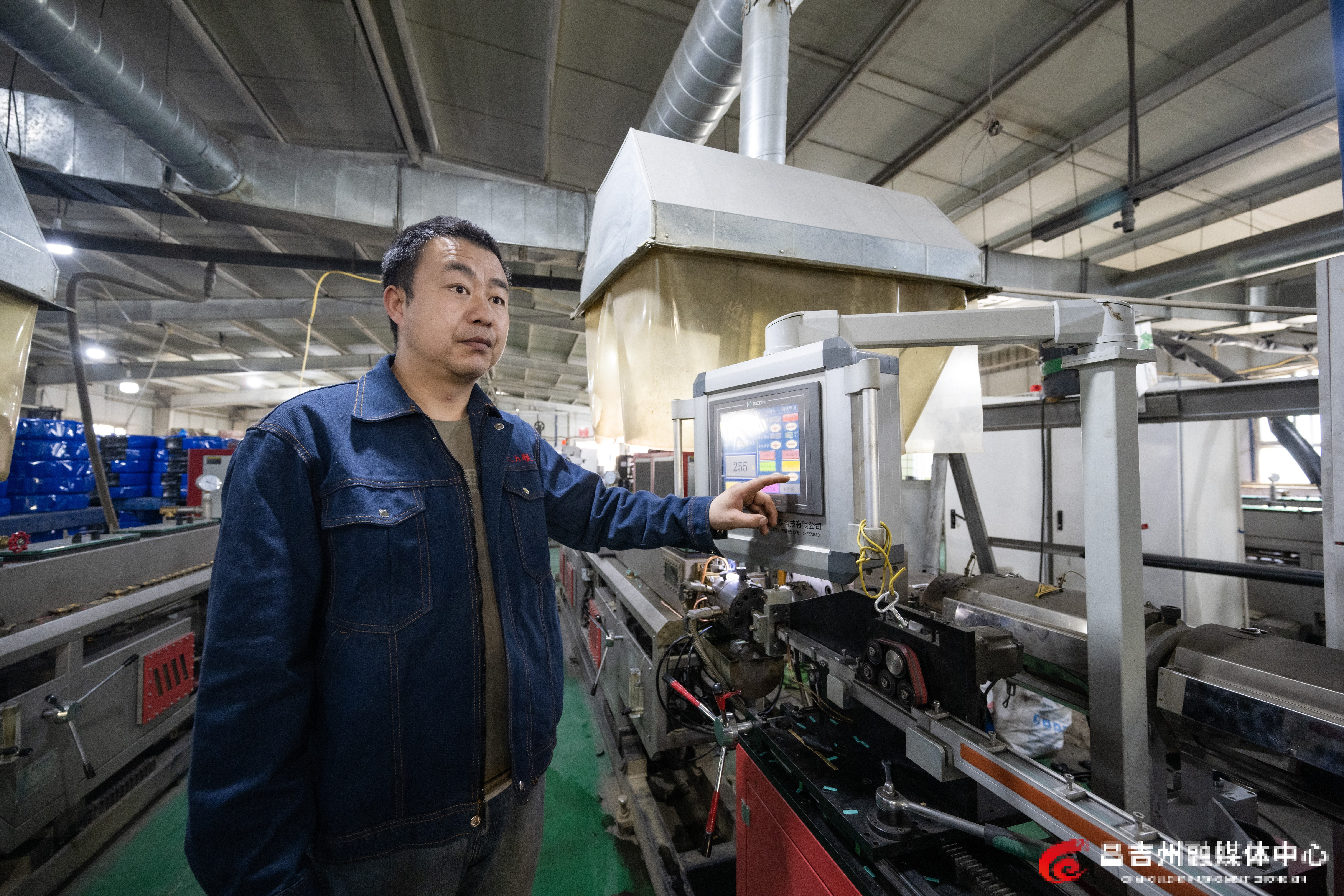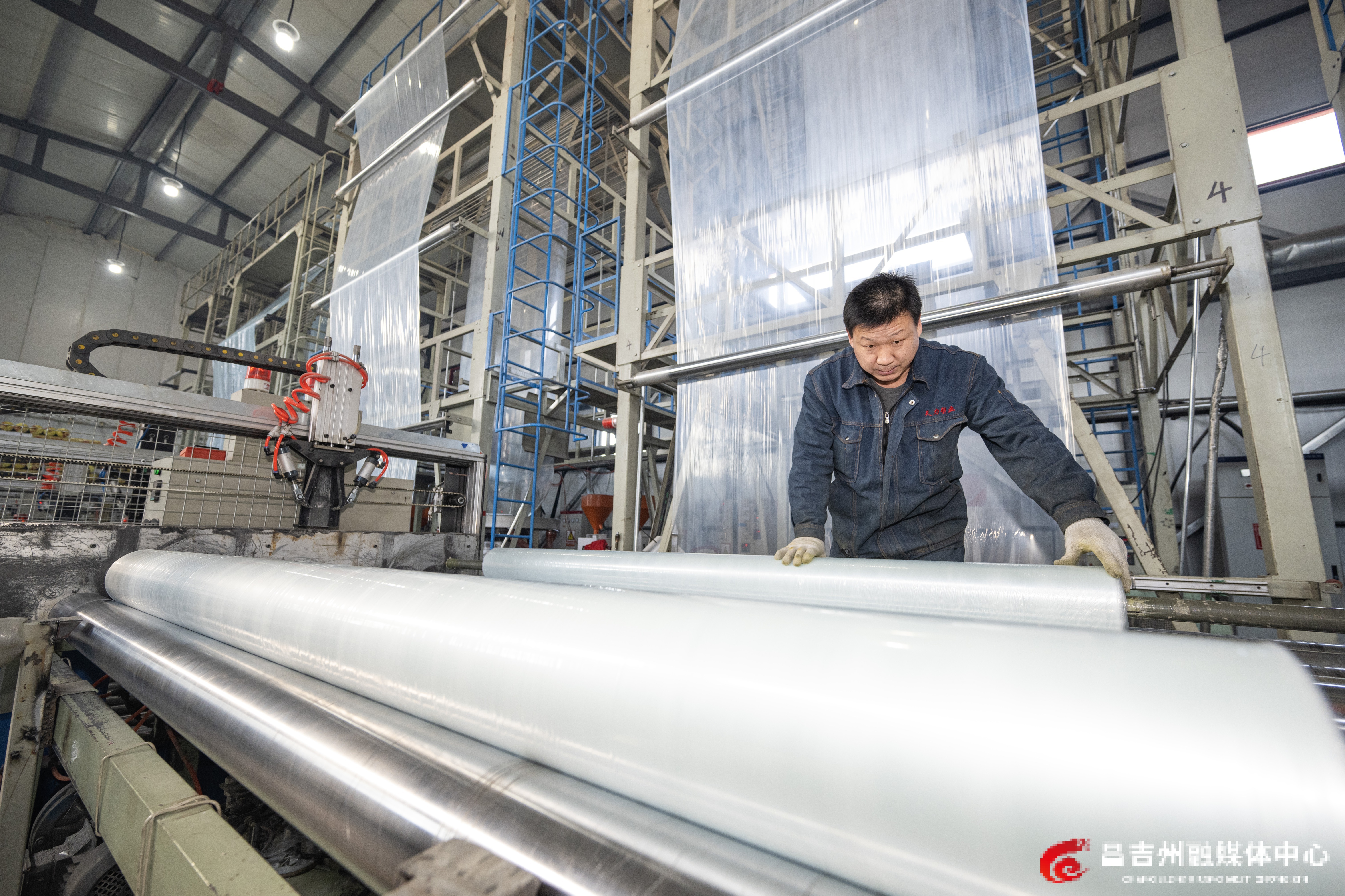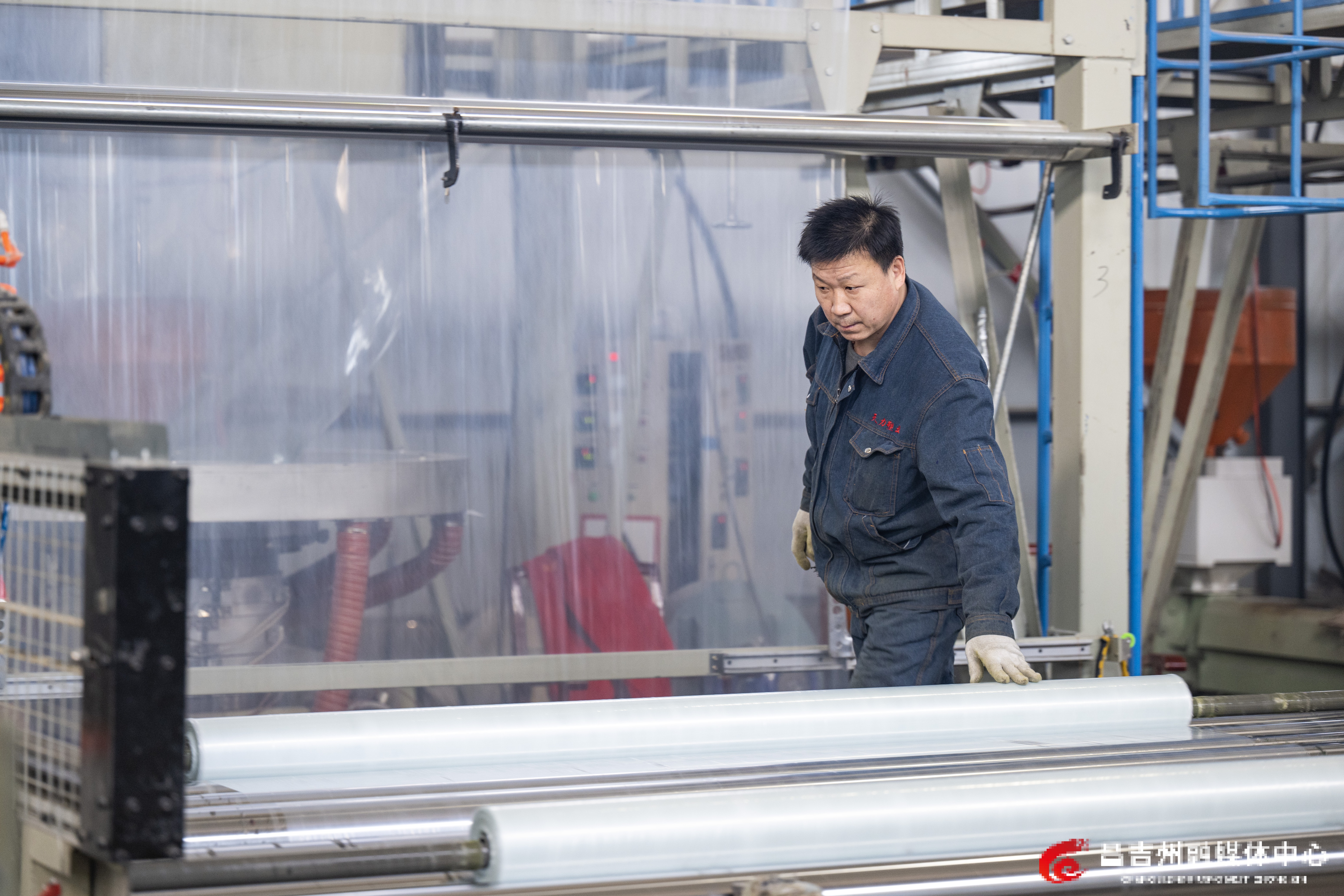 3月15日,昌吉市天力塑料厂地膜生产车间,工人在生产线上作业。