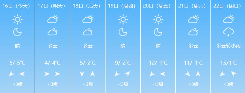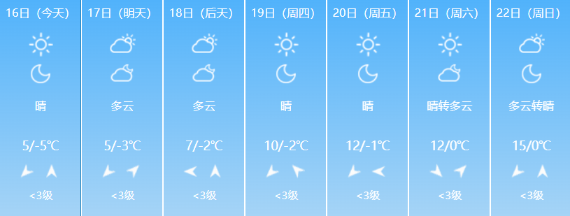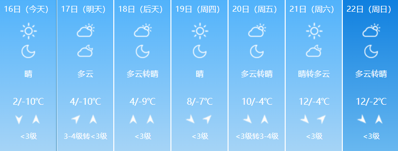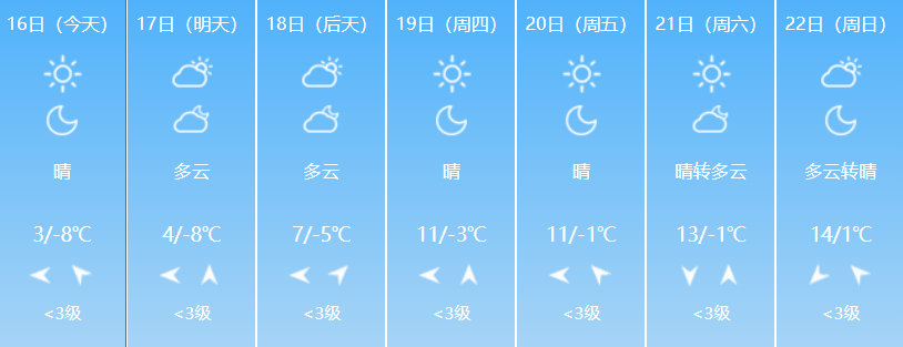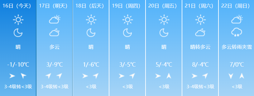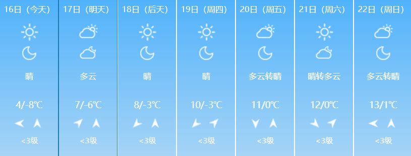 3月16日白天至18日白天,大部地区晴,日最高气温平原将升至10℃~12℃,山区将升至6℃~10℃。17日,奇台县北部及木垒县部分地区有7~8级偏东风。