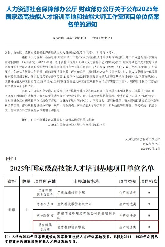 A+ A. A-丝路昌吉/昌吉州融媒体中心讯(通讯员 常慧报道)近日,人力资源和社会保障部(以下简称人社部)办公厅与财政部办公厅联合发布《关于公布2025年国家级高技能人才培训基地和技能大师工作室项目单位备案名单的通知》,经人社部和财政部组织复核,昌吉职业技术学院(昌吉技师培训学院)从全国众多参评单位中脱颖而出,成功入选2025年国家级高技能人才培训基地项目单位,全疆仅有4家单位入选。