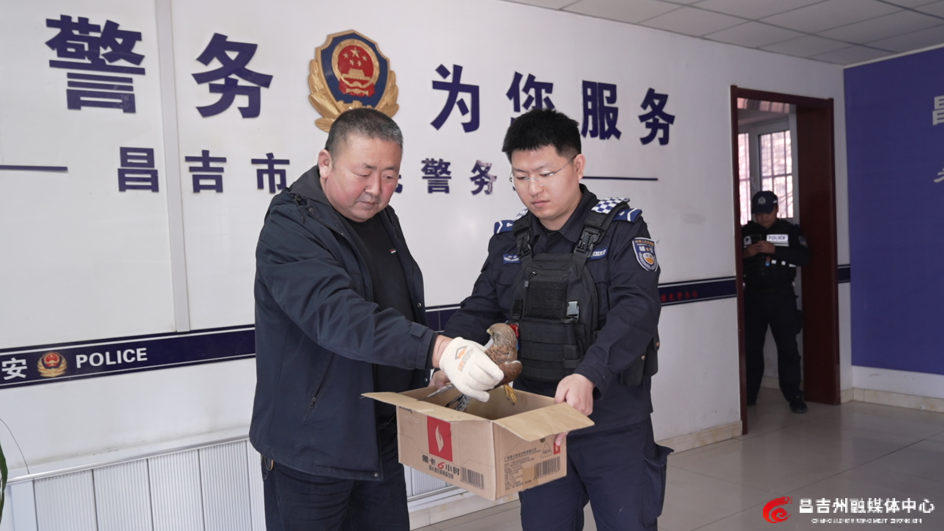 昌吉市公安局中山路街道派出所永胜便民警务站民警将受伤的红隼转交给昌吉市草局工作人员送医救治。记者常建洋 摄